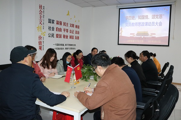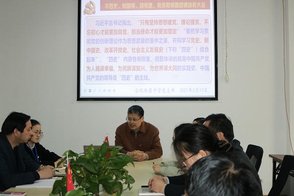 为庆祝中国共产党建党100周年和贯彻习近平总书记在学校思想政治理论课教师座谈会上的讲话精神,切实提升我校党员教师思政课水平。3月17日,合肥新康中学党支部召开“学四史、知国情、颂党恩,党员教师思政课”动员大会。包河区教体局非公党建指导员王安书记应邀参会。