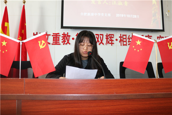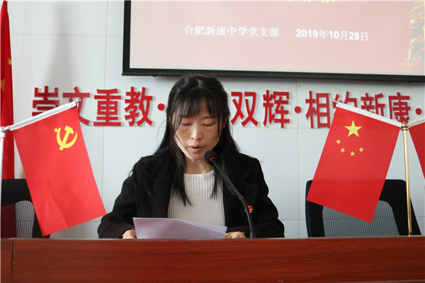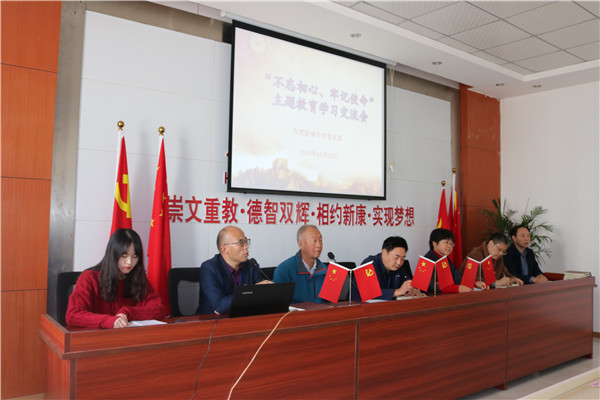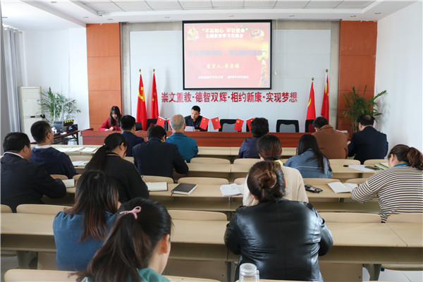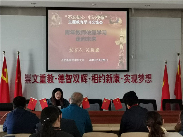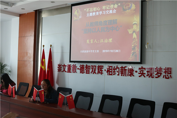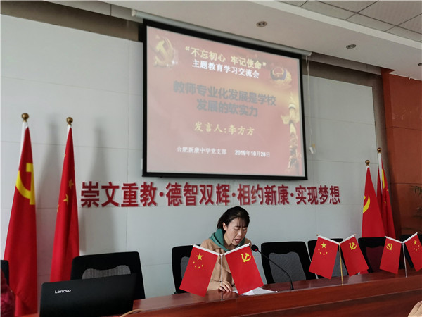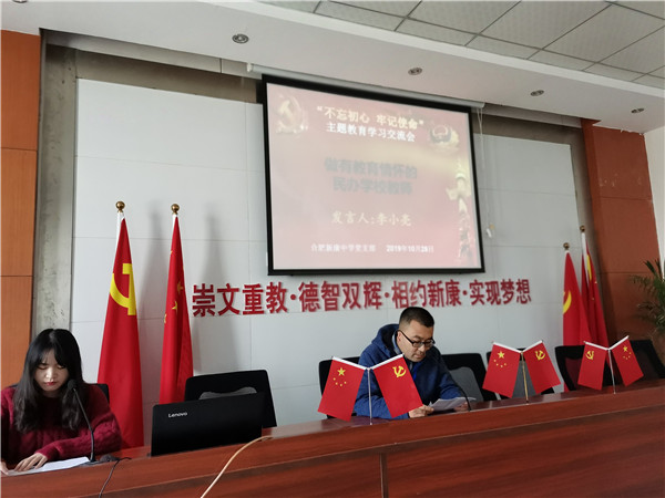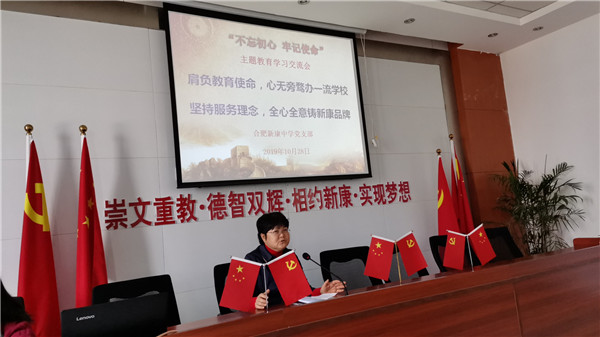 10月28日上午,合肥新康中学党支部围绕“肩负教育使命,心无旁骛办一流学校;坚持服务理念,全心全意铸新康品牌”这一主题,举行第二场“不忘初心、牢记使命”主题教育学习交流会。市教育局督导刘建国,包河区教体局主题教育第三巡回指导组组长陆桂云及成员宋中锋,包河区第四批非公企业党建工作指导员王安四位同志应邀出席。高中部语文组张玉同志主持。