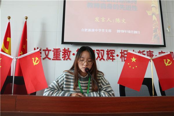 学校深入开展“不忘初心、牢记使命”主题教育学习活动,“如何在新时期保持教师自身的先进性”是每一位老师都应该思考的问题,这也成为陈文老师发言的标题,陈老师认为党员教师必须坚定政治信念,提升理论水平,每日三省吾身,发现解决问题,练就育人本领,保持领先水平。