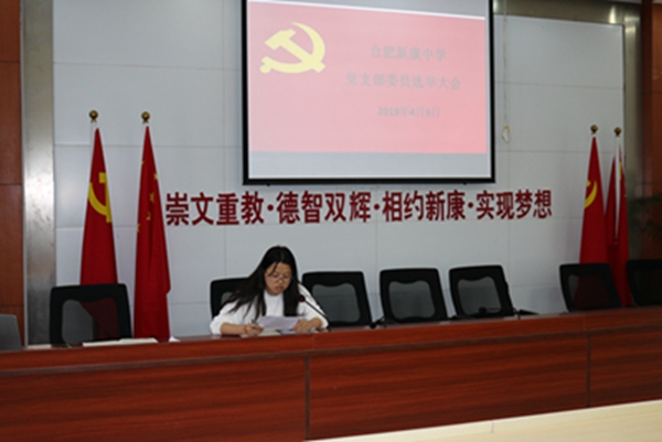 汪淑青同志首先通报参会人数和参选人资格符合党章相关规定。宣读了选举办法和候选人名单,推选监票人、计票人名单。投票环节中,严格按照公平、公正、公开的原则,由专门监票人和计票人唱票并宣读结果。经有选举权的党员同志进行无记名、差额投票,选举王俊同志担任合肥新康中学党支部书记。