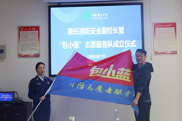 第四项:包河区消防救援大队涂苗苗主任为合肥新康中学消防安全联络员孙鹏主任授旗。