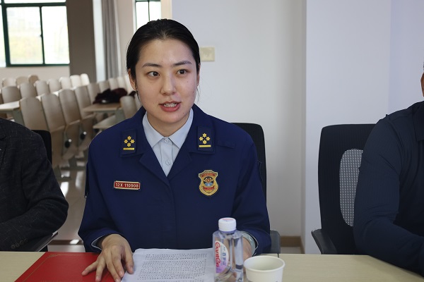 “包小蓝”志愿者代表韦静君发言:从日常生活中的小事做起,关注消防安全问题;自觉爱护消防栓、灭火器等消防设施;提高消防安全意识,培养预防火灾的好习惯。