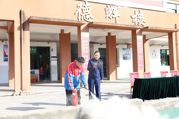 陈宣讲员指导学生正确使用灭火器。