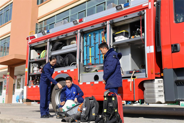 骆岗中队的消防员为学生展示、讲解消防装备的使用方法。