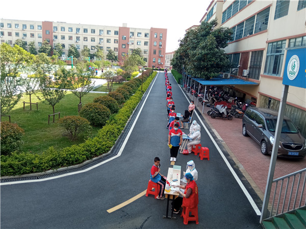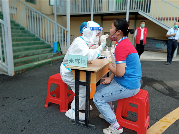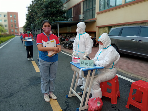 由于检测任务重,时间紧,在原定的检测中心物资不够,人员周转不足时,烟墩街道烟墩工作站核酸采样点及时向学校提供应急支援,派驻数名采样工作人员到校,为全校剩余900多名学生提供核酸采样服务。