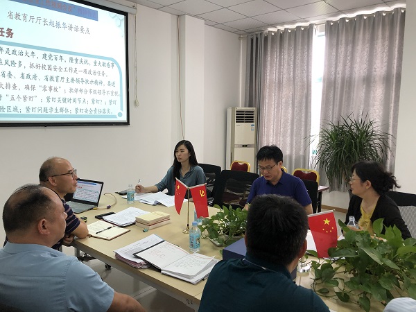随后,市教育局督导顾明书记对我校党史学习教育开展情况做了汇报,初、高中学部徐学法、段方校长就近期“五项管理”落实情况进行详细介绍。