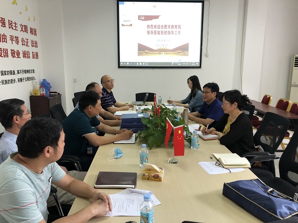 为推动我校党史学习教育,严格落实安全责任,6月2日下午,合肥市委教育工委专职副书记李仲生、市教育局四级调研员杨帆等一行4人,对我校开展巡回指导工作。市教育局督导顾明书记、校董事长王俊、专职副书记陈晓永等行政班子成员全程陪同。