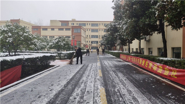 早晨7:20左右,初中部徐学法校长查看完学生晨读之后,第一个拿起扫把开始清扫积雪,门卫盛师傅随后加入,陈晓永副书记给他俩拍下最早最美的背影。后勤卫志荣副主任开始分发工具,后勤宇汝章、罗锋两位副主任,张伟华、孙鹏老师,相继加入清理初中部学生公寓主干道,成为一道亮丽的风景线。队伍在不断扩大,高中部李韦、魏鑫、王锐和樊浩四位老师积极行动起来,开始清扫高中部教学楼至食堂主干道。随后,徐校长、龚校长、余成祥、孙鹏和王林老师又转战食堂门口至初中部教学楼主干道,余成祥还在教学楼东侧拉起警戒线。高中部韩丽、程小旺和范先云三位生活老师清理学生宿舍门口积雪,初中部张苹等生活老师彻底清扫宿舍楼梯道积雪,并且用干拖把拖干地面,防止楼梯结冰。