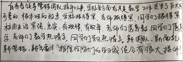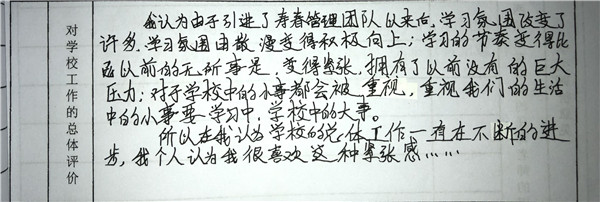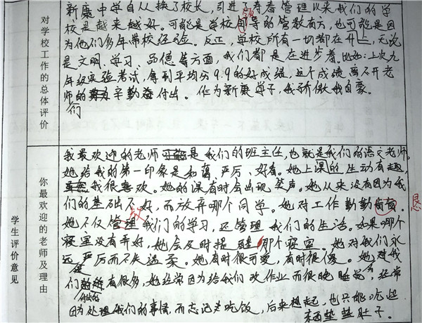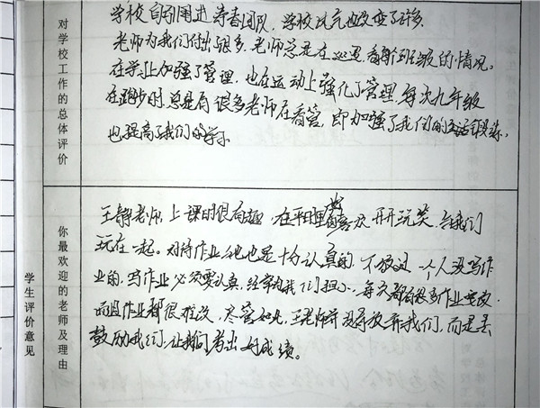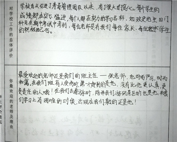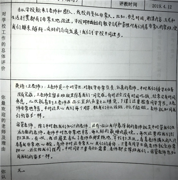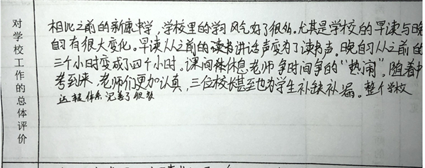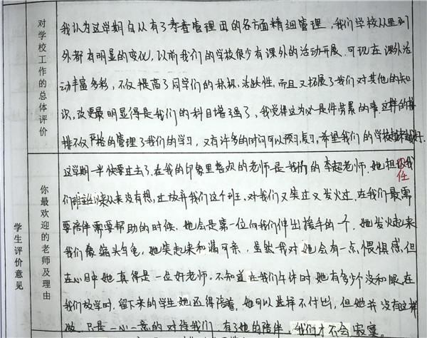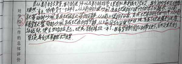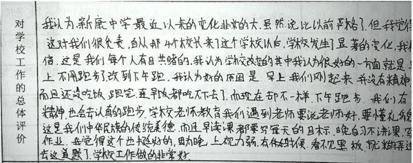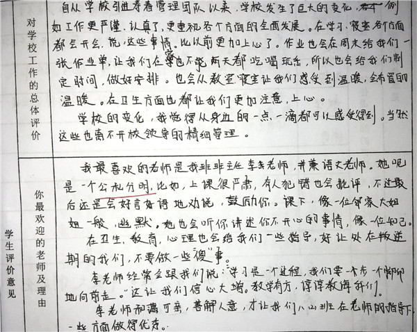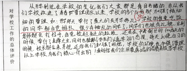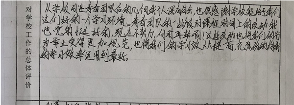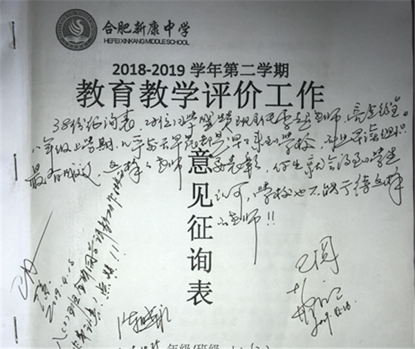【编者按】 在寿春管理团队的倾力打造下,合肥新康中学发生了翻天覆地的变化,赢得了学生和家长的良好口碑。我校于2019年4月开展了教育教学评价工作(简称“评教”工作),征求学生和家长对学校教育教学工作的意见和建议。学校、家长对寿春团队精心打造后新康中学的蜕变给予高度评价。这既是对我们的肯定,也是对我们的鞭策。我们将此化作我们前行的动力。现从评教表中选取部分学生的评价,以飨读者。