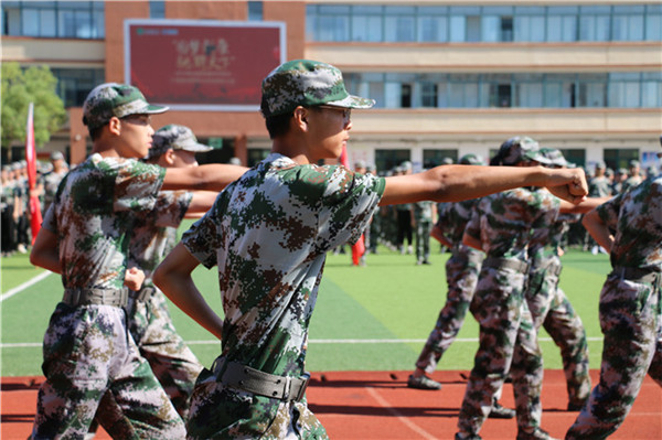 飒爽英姿五尺枪,曙光初照演兵场。上午九点,汇报表演正式开始,第一项进行的是分列式,十三个连队依次进场,他们昂首阔步、步伐整齐、口号嘹亮,迎着旭日朝阳,光芒万丈。第二项进行的是军体拳、擒敌拳的表演,同学们双拳紧握,出拳、踢腿、转身,动作到位,节奏一致,一招一式有模有样,每出一招,便吼一声,动作与声音相互配合,声势震天,表演精彩万分。