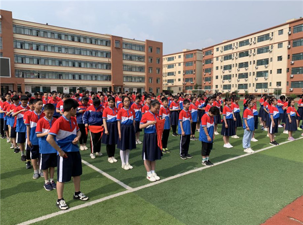 2019年5月31日下午3时,由合肥新康中学初中部团委主办的少先大队离队仪式暨团前教育活动在新康中学操场举行。全体七年级的学生告别了红领巾,开始了崭新的人生征程。