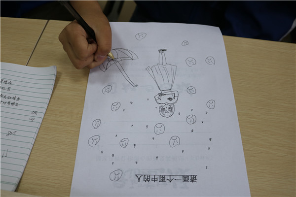 现场的互动中,填写《目标和行动卡》的练习将讲座推向高潮。李老师让同学们自行填写了《目标和行动卡》并在卡片背后画下了“雨中的人”。在老师的鼓励下,高三的三位学生代表分别上台宣读了自己的目标和行动策略,赢得了同学们的赞许。三位班主任老师代表也分别在活动现场寄语考生,李老师还给出来“考试期间十个一”的建议。