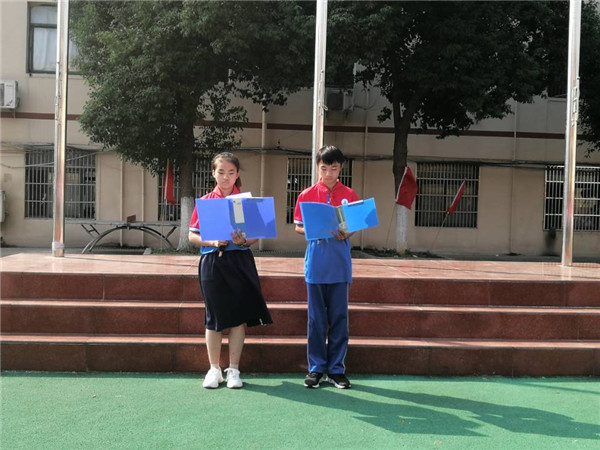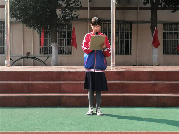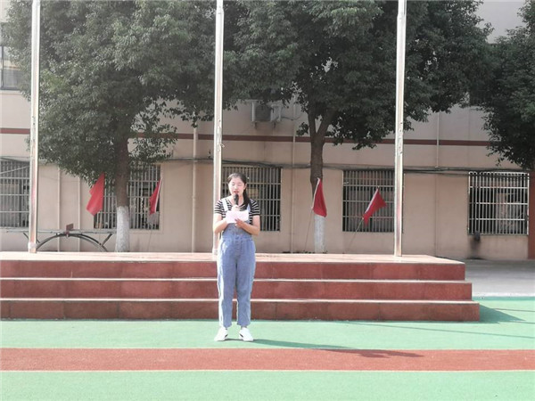 七年级的范舒熙同学在国旗下做题为《在国旗下成长》的发言,她向同学们介绍了五星红旗所代表的含义,回忆了《开学第一课》中讲述的中国登山队将五星红旗插上珠穆朗玛峰的壮举,以此来告诉同学们要敬爱五星红旗,要敬爱我们的祖国母亲。