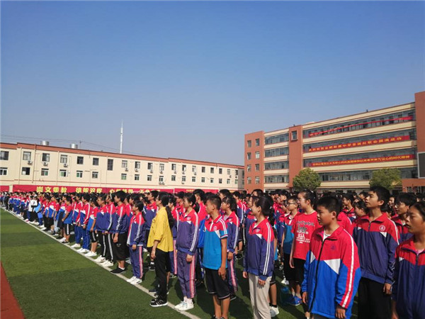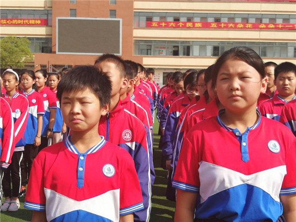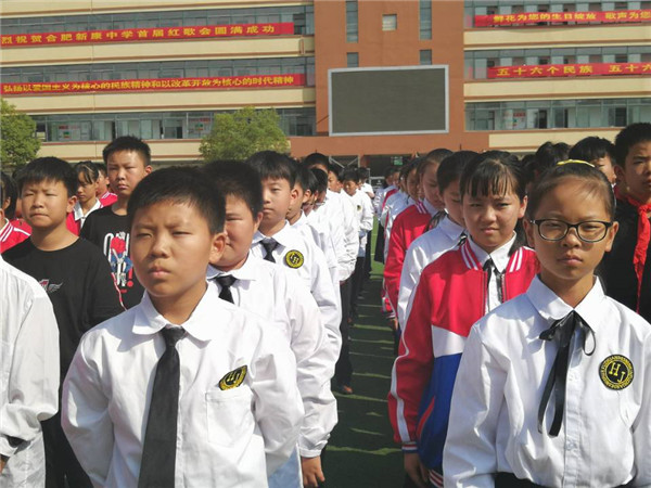 升旗仪式开始了,嘹亮而雄壮的国歌声响起,学生们笔直竖立,七年级少先队员佩戴鲜艳的红领巾,行队礼,其他师生行注目礼,并高唱国歌,这一刻新康师生的爱国之情和对祖国母亲的祝福之情不断升腾。