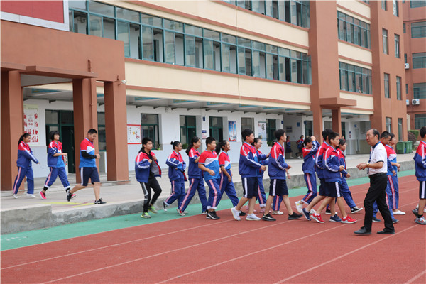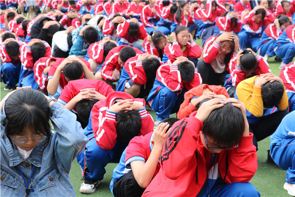 9:18分,警报响起,各班同学迅速反应,按照既定撤离路线快速撤离至操场,并进行室外防空演练,他们双手抱头,原地蹲在地面。