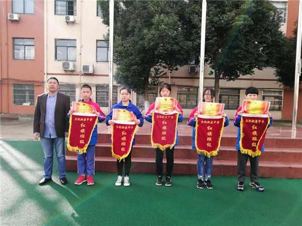 德育处李副校长在活动上宣读了在九、十月份获得红旗班级的班级名单,徐校长为获奖班级颁奖并合影留念。