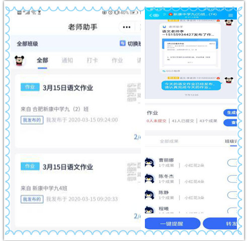 1、老师布置当天的作业,学生会单独收到一份作业,而且qq群里也会显示作业,到规定时间交了多少人,没交多少人都能清楚的跟踪到,可以及时跟家长沟通,这样就到了一个不遗漏,保证了课后作业的落实效果。