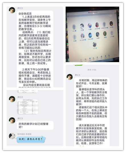 接到通知后,学校高度重视,并于2月24日、2月25日分别召开了初中部行政视频会议、备课组长视频会议,为3月2日后的线上教学工作做准备。行政会上徐校长布置教务处制定第二阶段的线上教学实施方案,在线上教学细节方面要更加完善,如学生线上作业打卡、老师在线批阅、课后及时跟踪等都做了明确要求,布置德育处制定“致学生的一封信”,并做好每日学生疫情时期的零报告、日报告以及学生的外出轨迹情况。为了给后期开学工作做好准备,对于防护用品、校园消毒等方面徐校长都做了具体要求。