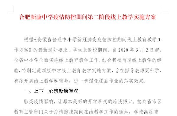 根据《安徽省教育厅 安徽省通信管理局 安徽省广播电视局关于印发<安徽省普通中小学新冠肺炎疫情防控期间线上教育教学工作方案>的通知》皖教基〔2020〕2号文件精神,要求各校自2020年3月2日起通过电视、网络等开展线上教育教学。