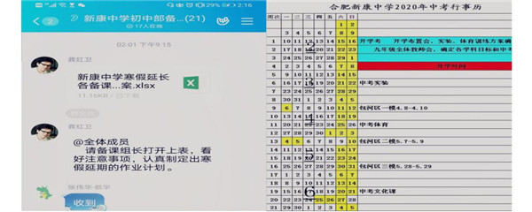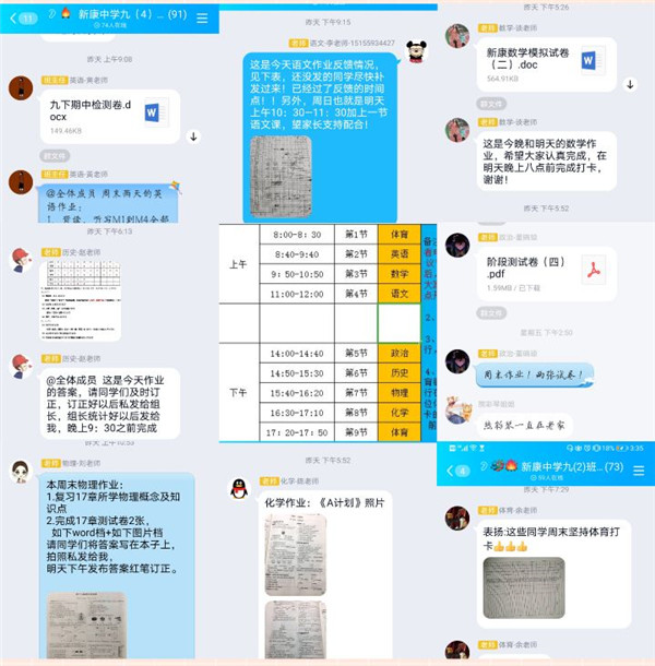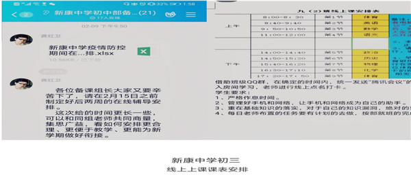毕业班的老师们除了统计孩子每日健康的数据,还要保证孩子的学习不被耽误。七八年级的学生在老师们的带领下以预习新课、寒假作业辅导以及名著阅读指导为主。教务处迅速针对不同年级,不同班级制定了课程表,并由班主任发布到各家长群里,及时告知孩子,让孩子们提前做好准备。