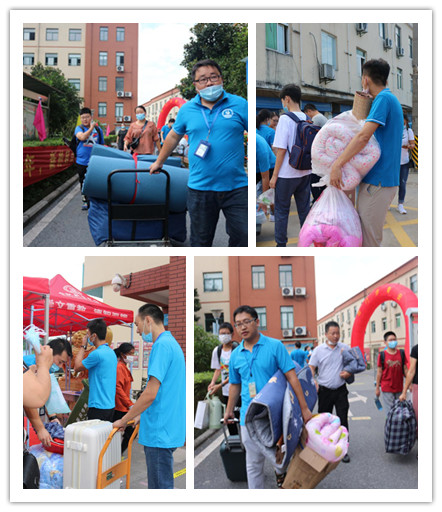 考虑到新生报到行李比较多,不好携带,老师们用手推车,一趟趟地穿梭在校门口与寝室楼之间。虽然天气炎热,老师们早已汗流浃背,但是他们的脸上总是洋溢着笑容,行走之间,还不忘提醒学生和家长们一些注意事项和接下来报道的流程。争取让家长们最快捷地办好入学手续。