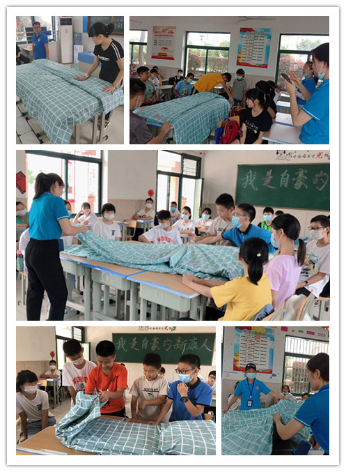 上午10点左右,生活老师们走进班级为同学们示范并指导学生们“叠被子”,为接下来更好的适应校园生活,打下基础。