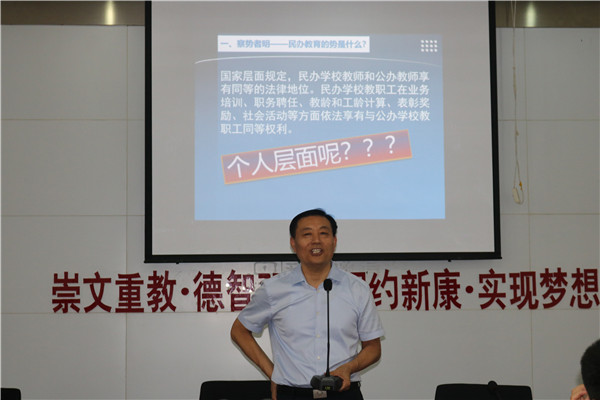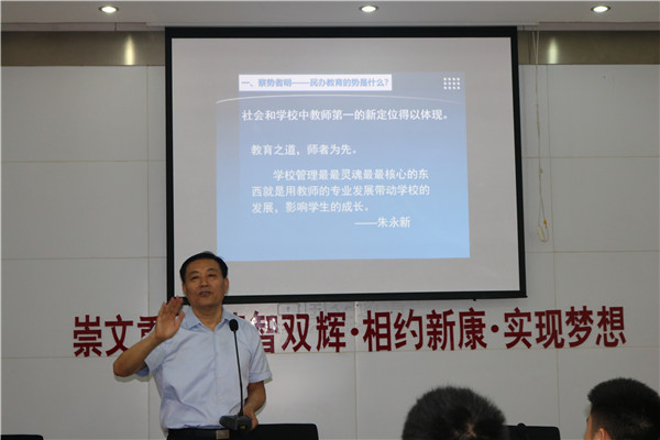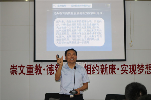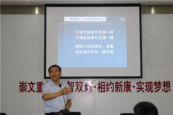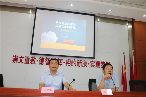 8月22日上午, 在我校初中部校本培训进行如火如荼之际,阜阳市教育局刁卫华局长应邀莅临我校作《从优秀走向卓越,从成功走向幸福—教师的专业成长之路》主题报告。