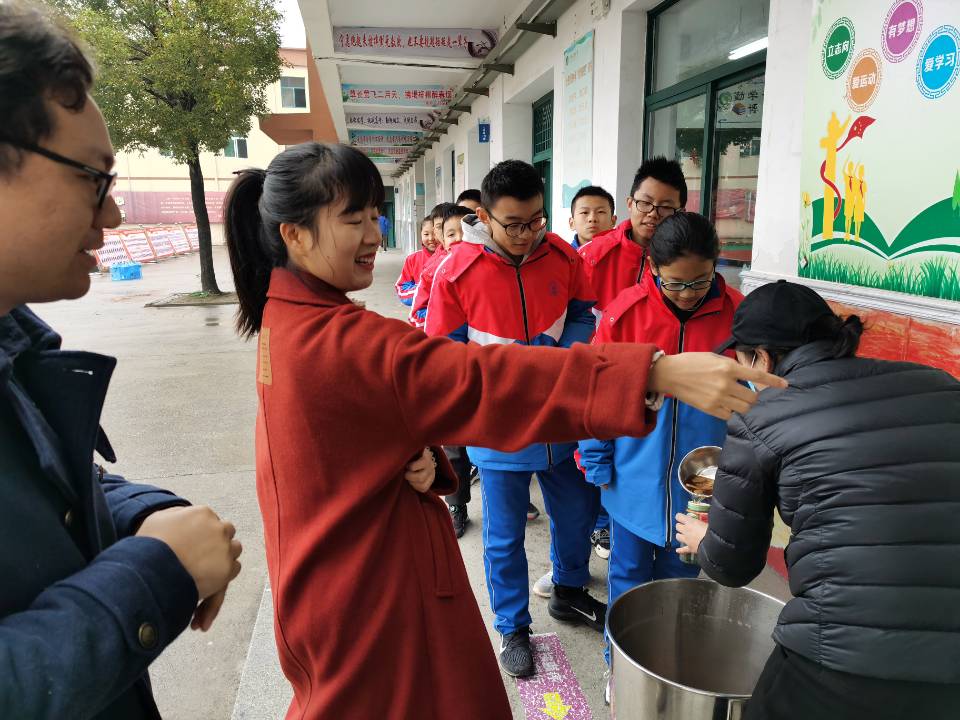 26日上午第二节课后大课间,四大桶热腾腾的姜糖茶送至初中部教学楼四个楼层,徐学法、龚红卫校长分层巡视,班主任、授课老师有序组织,孙鹏老师帮助食堂员工进行分发,诚如余成祥主任所言:15分钟,18个班级,600杯姜汤,体现了新康速度。