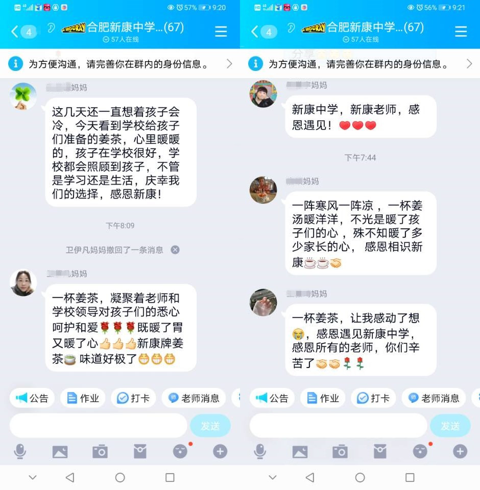 班主任老师拍下自己班级同学饮用姜糖茶的搞怪表情和美好瞬间,发至家长群,受到家长们纷纷点赞。