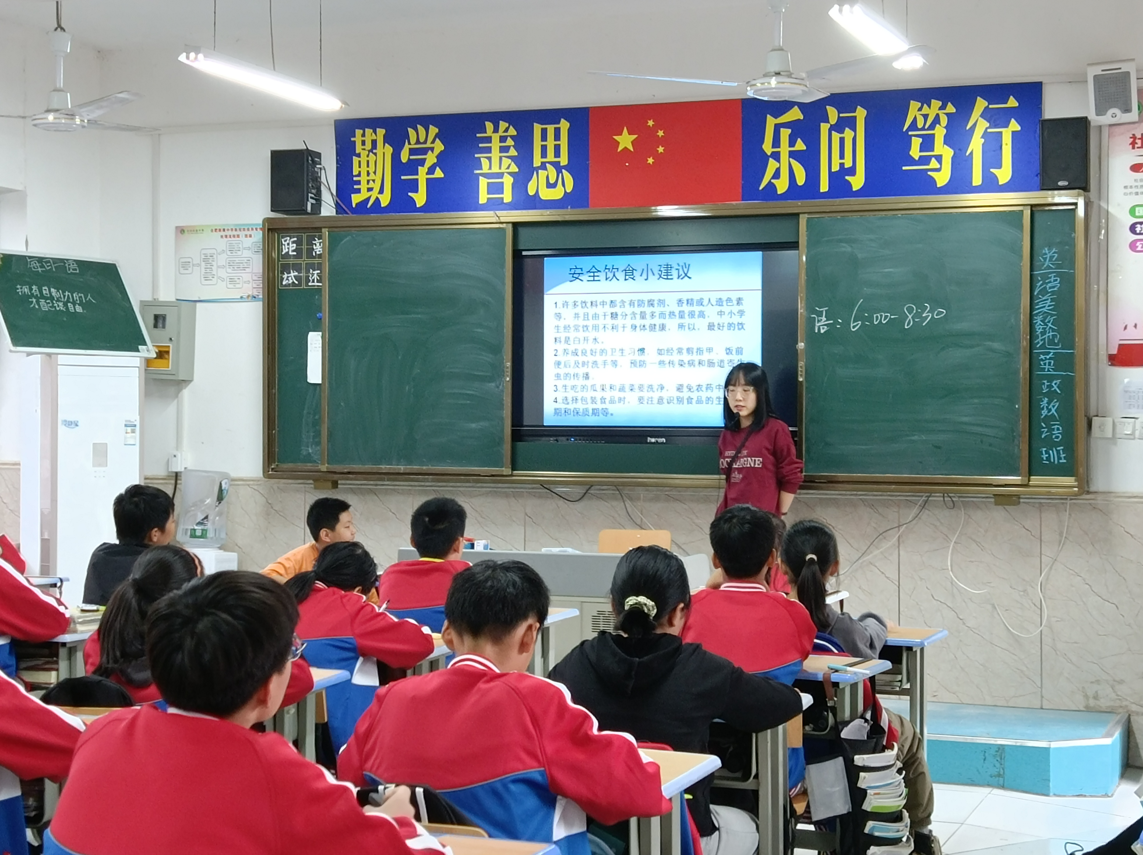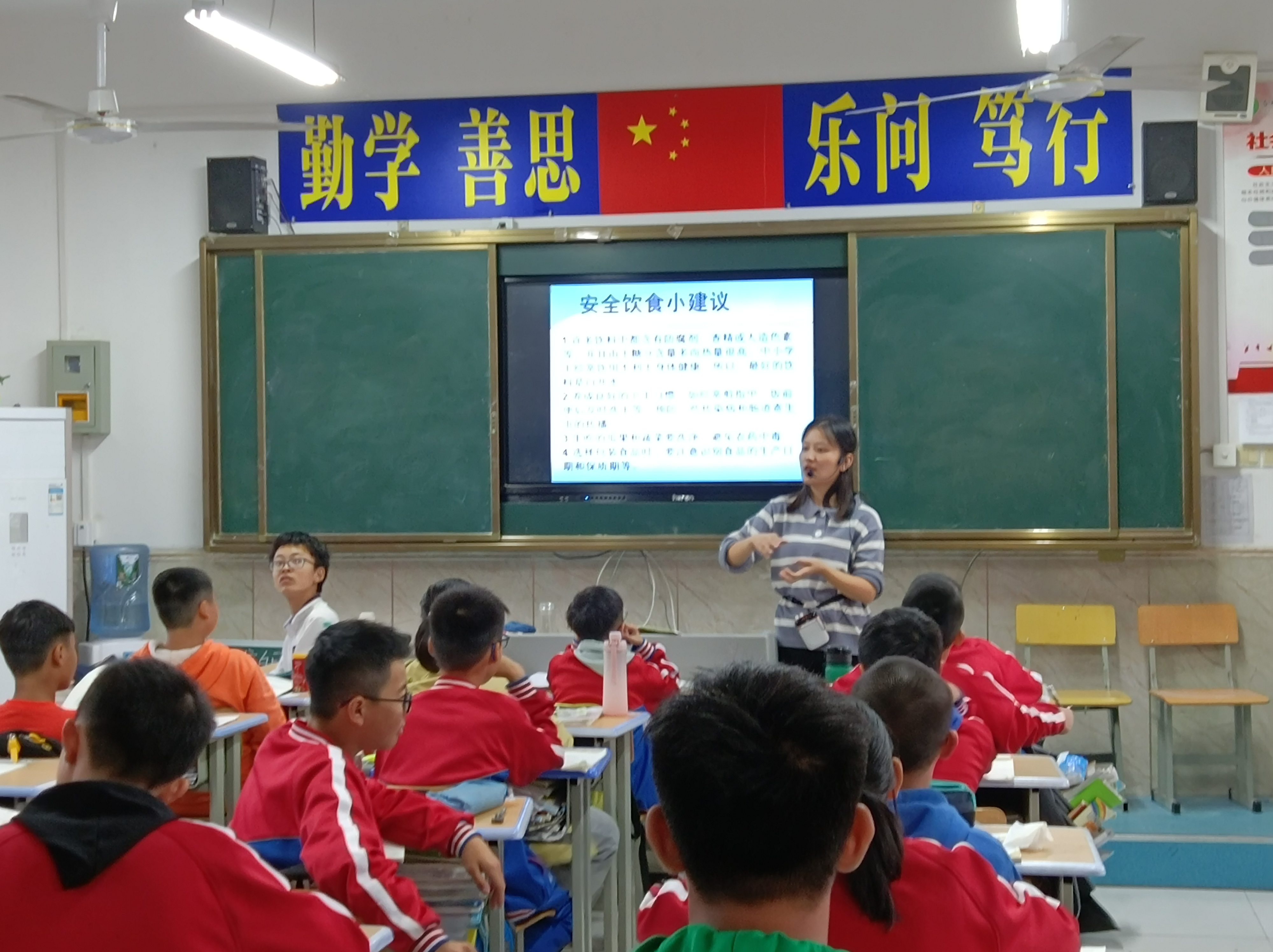食品安全是指食品无毒,无害,符合应当有的营养要求,对人体健康不造成任何急性,亚急性,或者慢性危害。10月12日的班会课上,张伟华老师描述了他观察到同学们不健康的饮食现象,指出吃垃圾食品对学生身体的危害,并向同学们介绍了生活中常见的十大有害食品,给同学们提供了十大健康有益的食品。