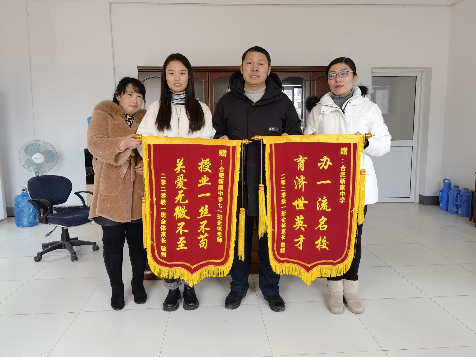2021年1月21日,七(1)班家长代表分别将绣有“办一流名校、育济世英才”和“授业一丝不苟、关爱无微不至”字样的两面锦旗送给主任王琪老师,借此感谢七(1)班全体老师对孩子的辛勤培养和用心付出。