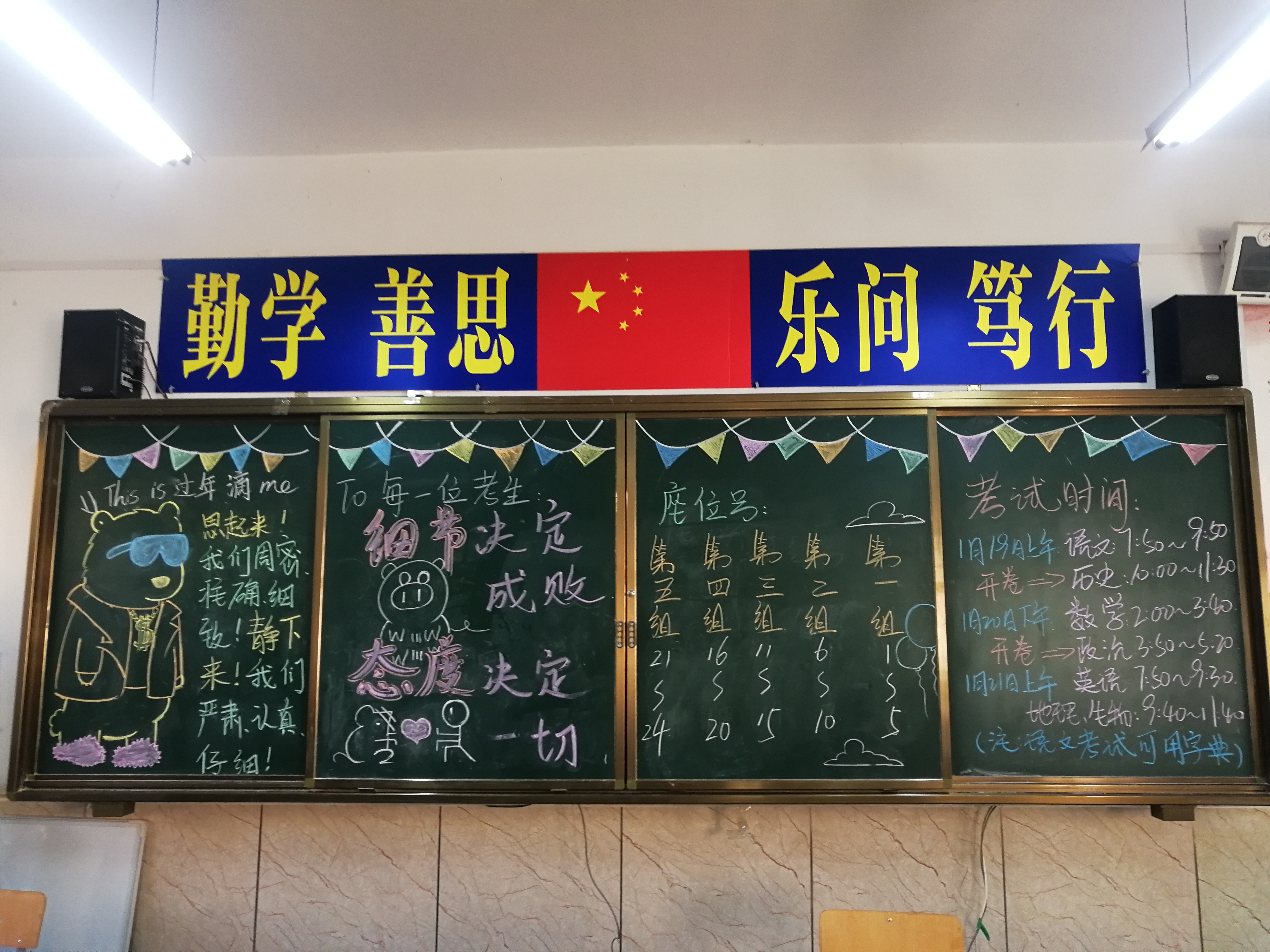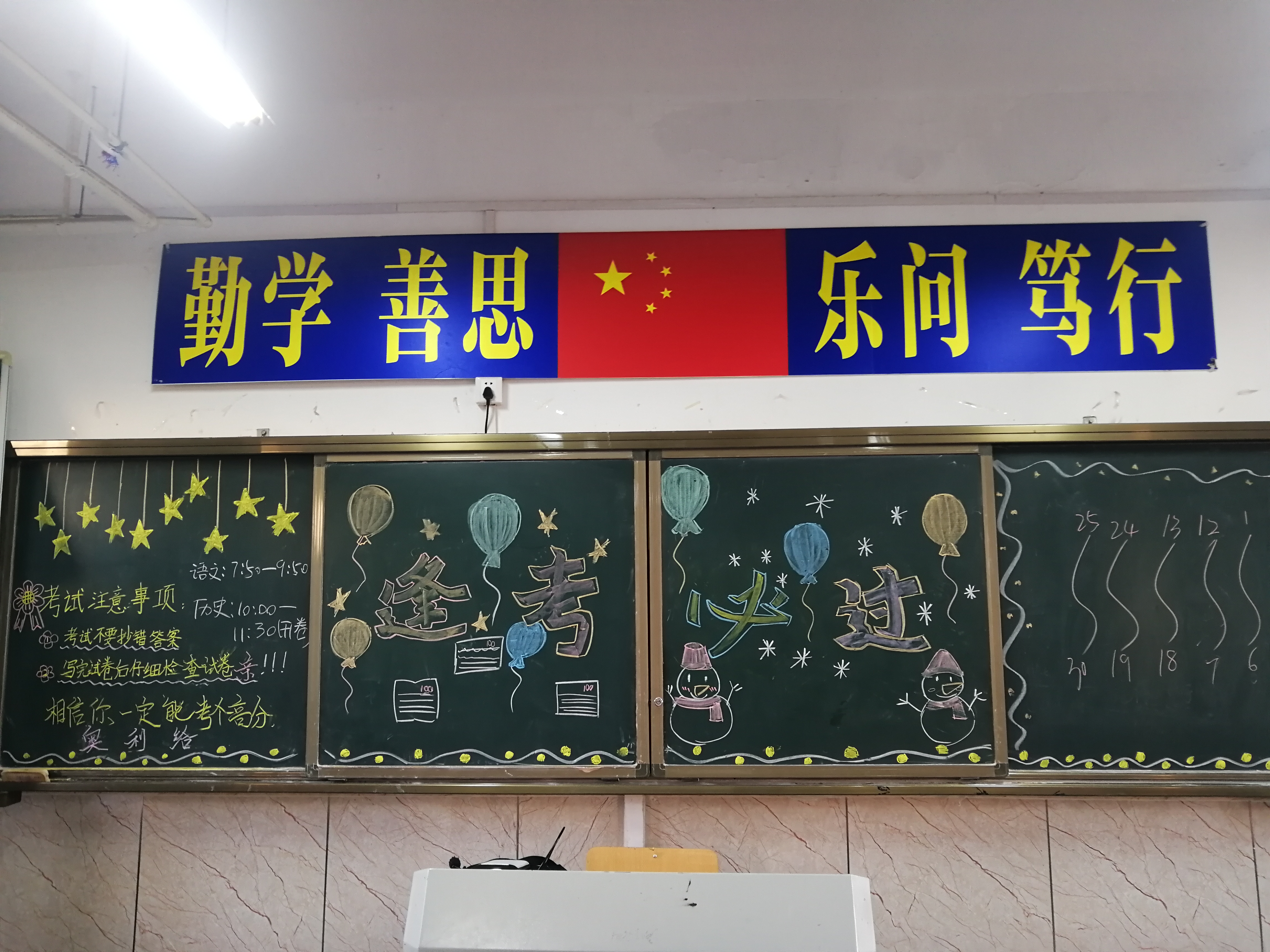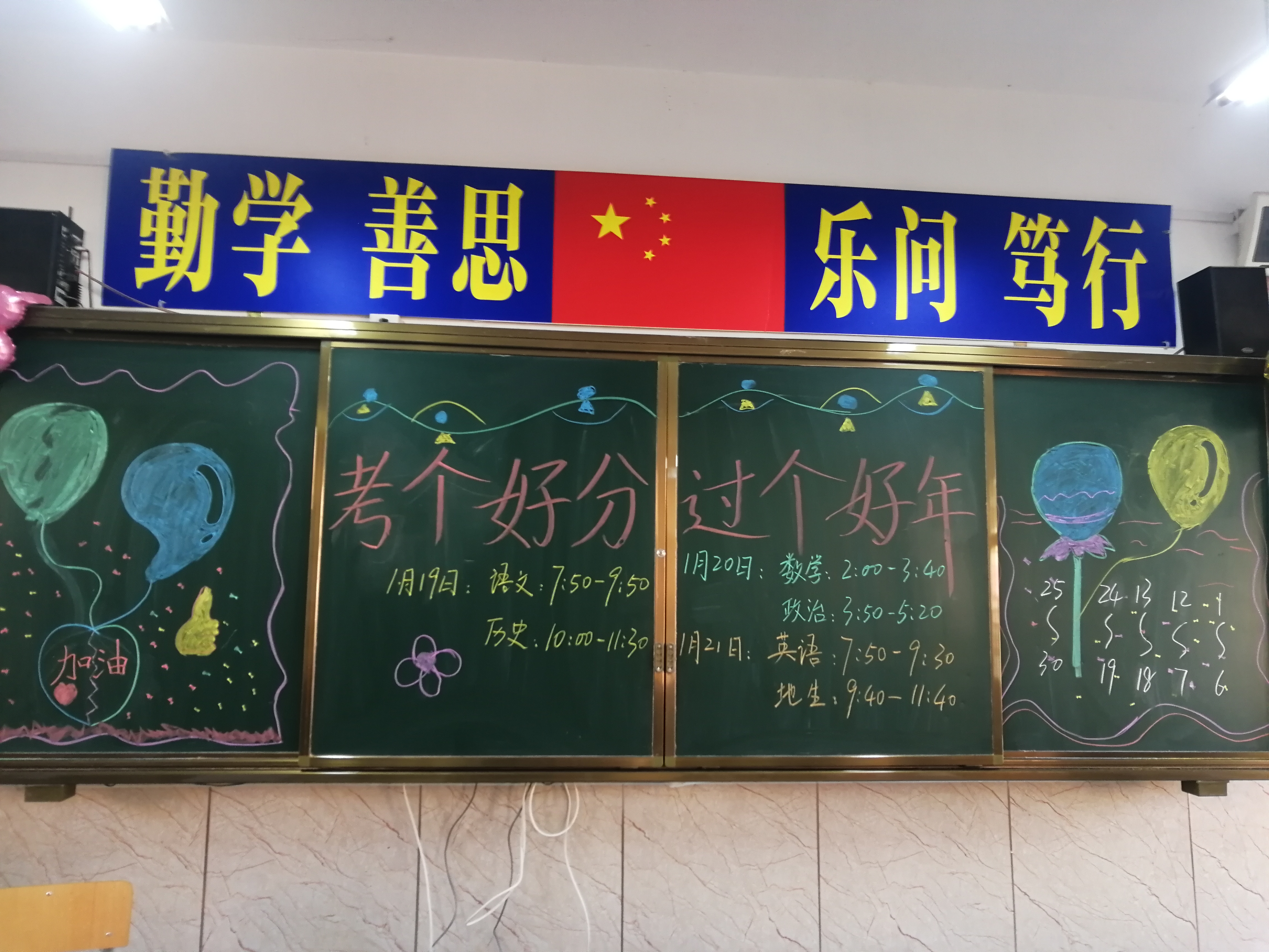 2021年1月21日,我校进行2020-2021学年度第一学期期末考试,为彰显班级文化,鼓舞学生期末考试信心,各班级按照教务处要求,进行黑板布置,各班级老师、学生各显神通,现将各班级黑板设计展示如下: