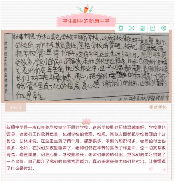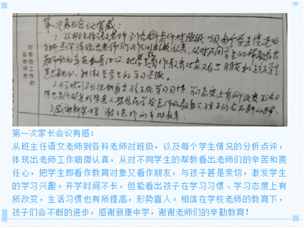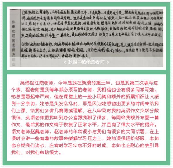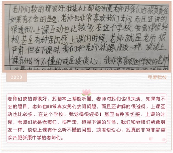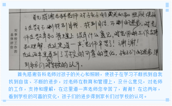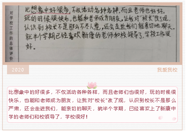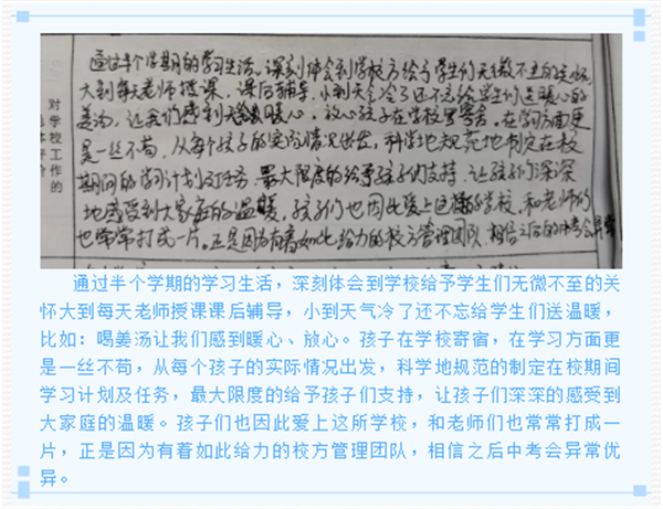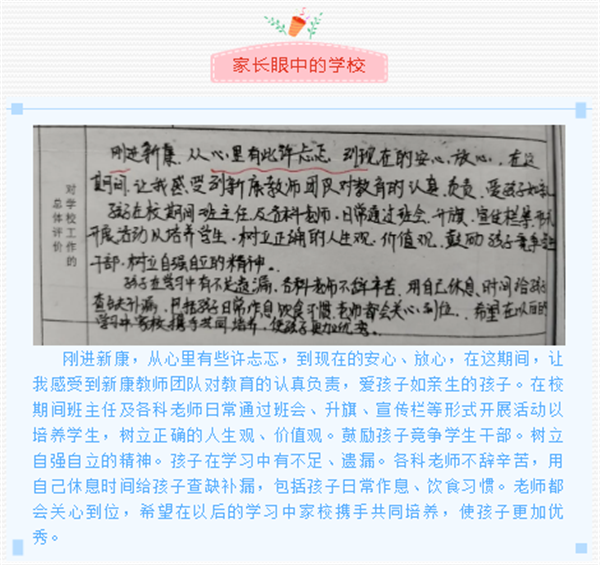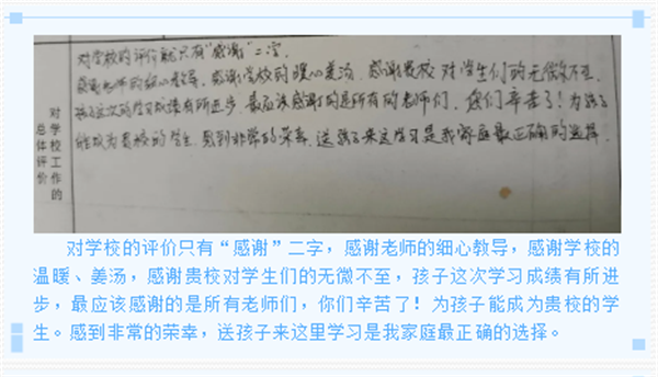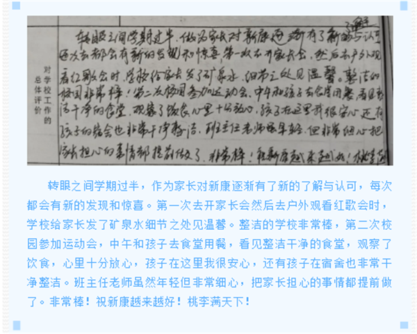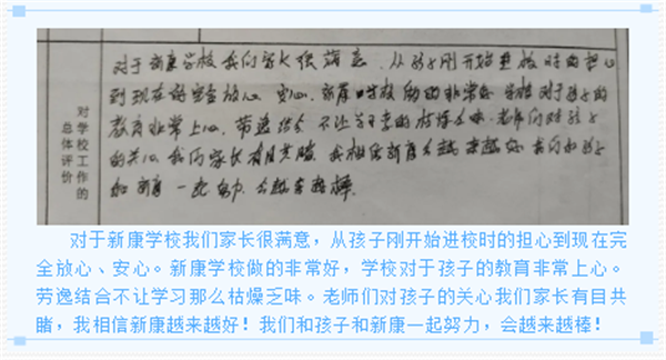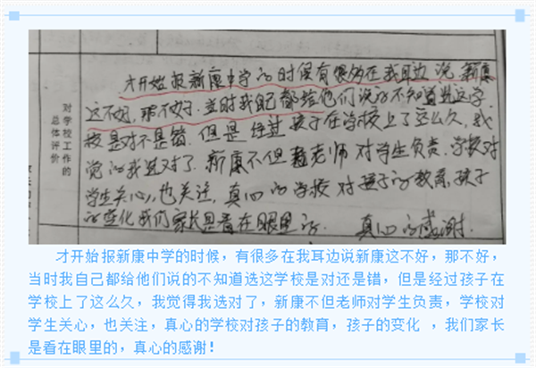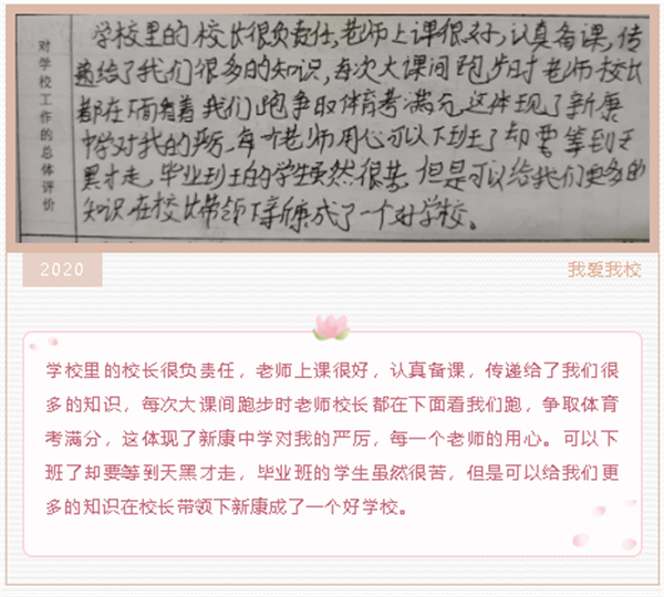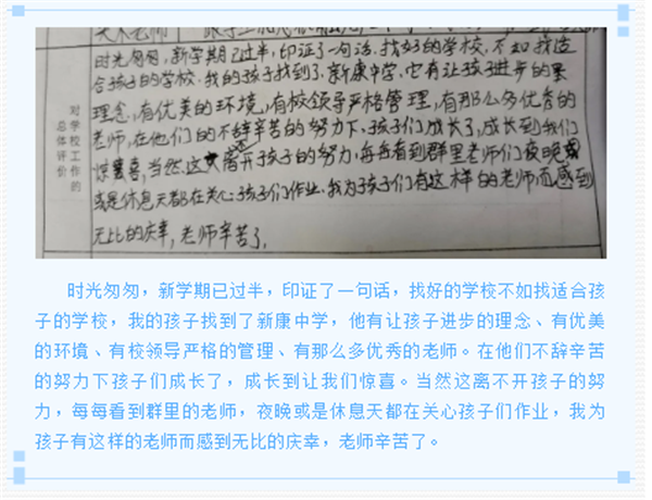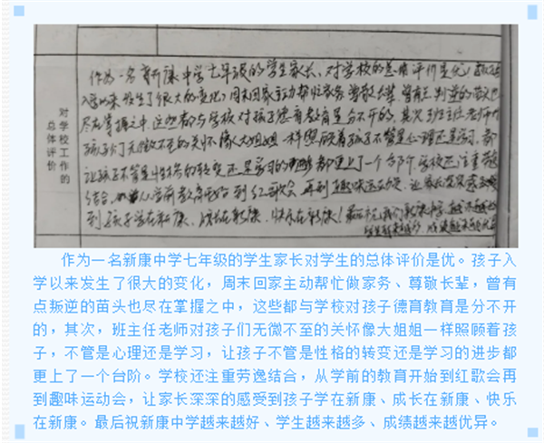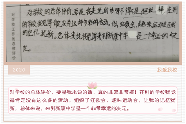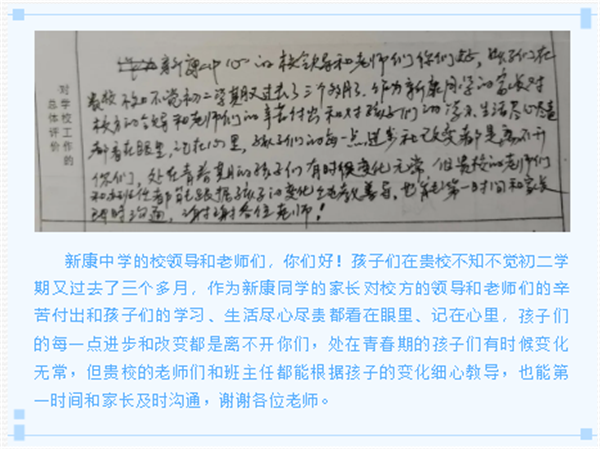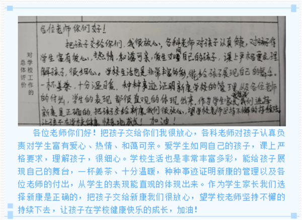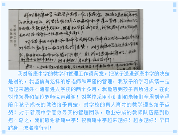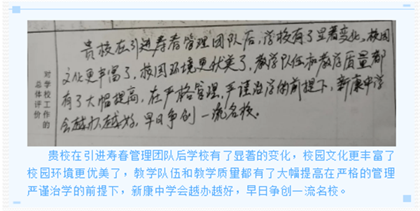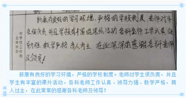 在以徐校长为首的管理团队接手新康中学以来,合肥新康中学发生了翻天覆地的变化,赢得了学生和家长的良好口碑。我校于2020年11月开展了教育教学评价工作,征求学生和家长对学校教育教学工作的意见和建议。学校、家长对以徐校长为首的新康团队精心打造后新康中学的蜕变给予高度评价。这既是对我们的肯定,也是对我们的鞭策。我们将此化作继续前进的动力。现从评教表中选取部分学生的评价进行展示。