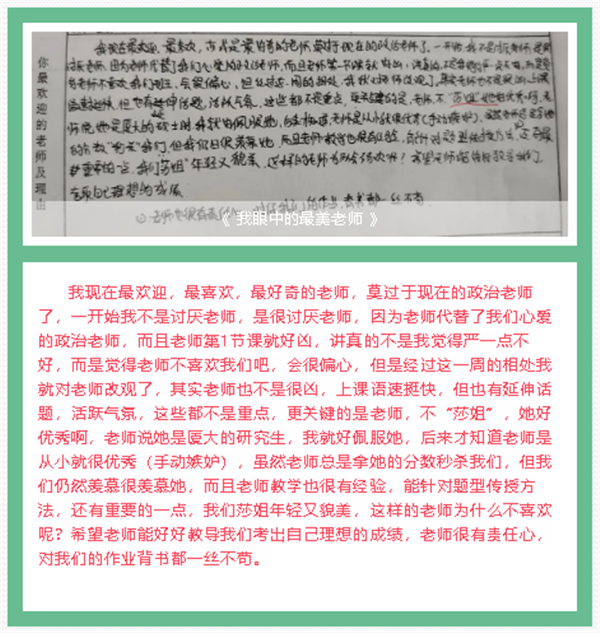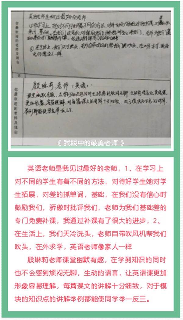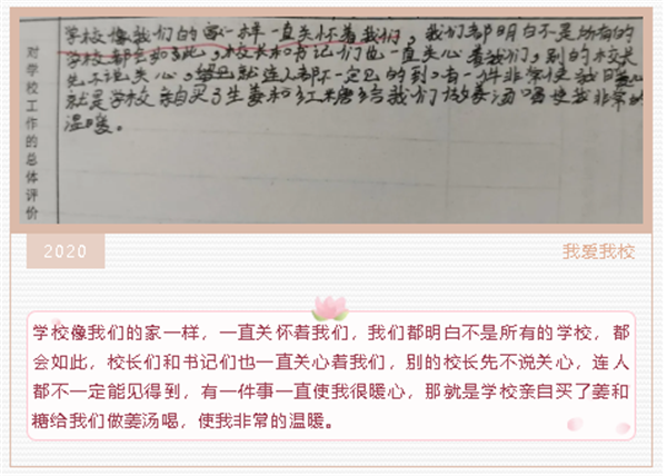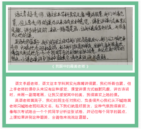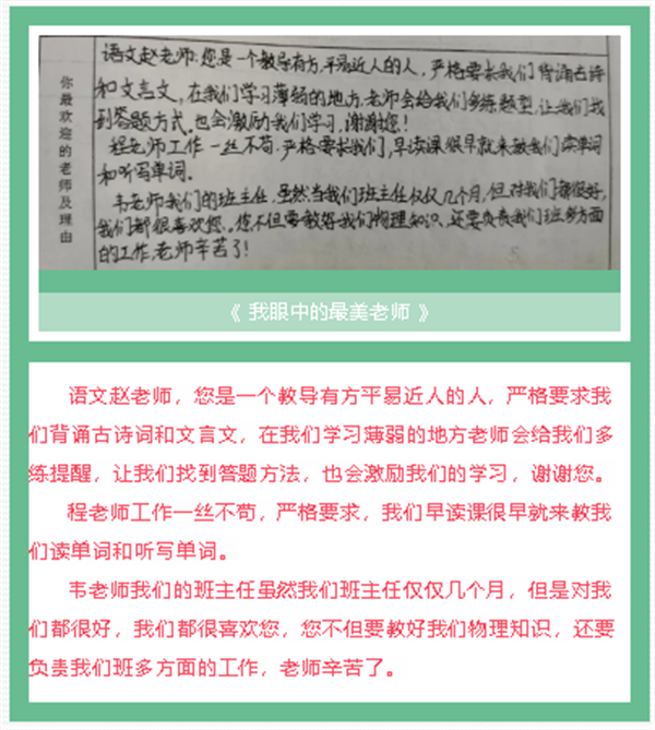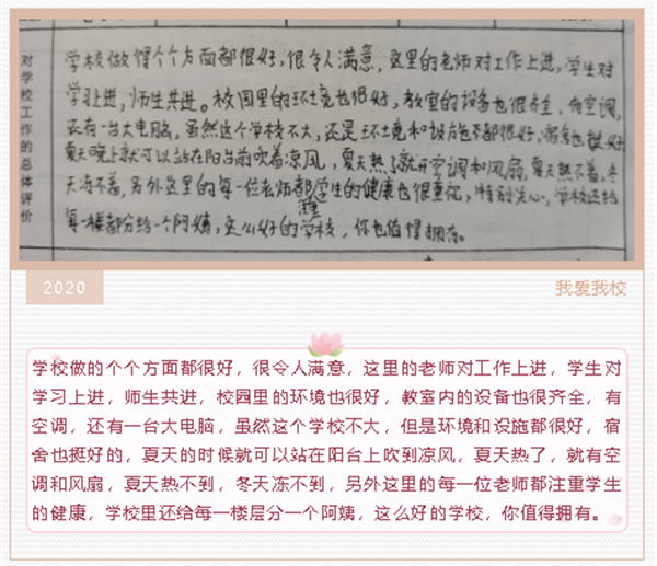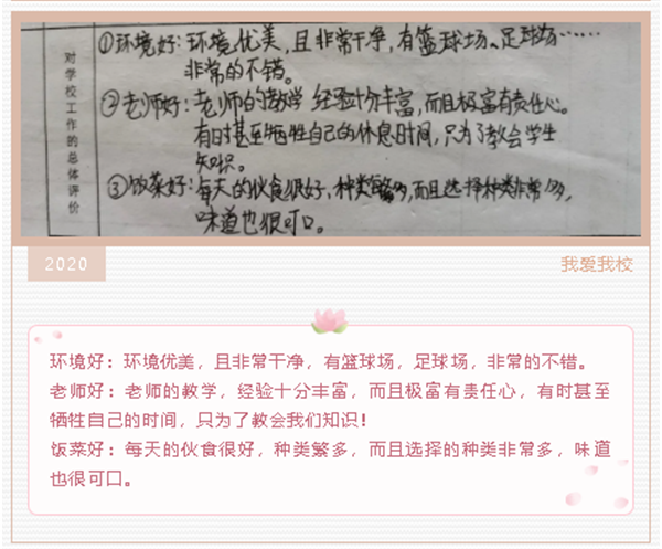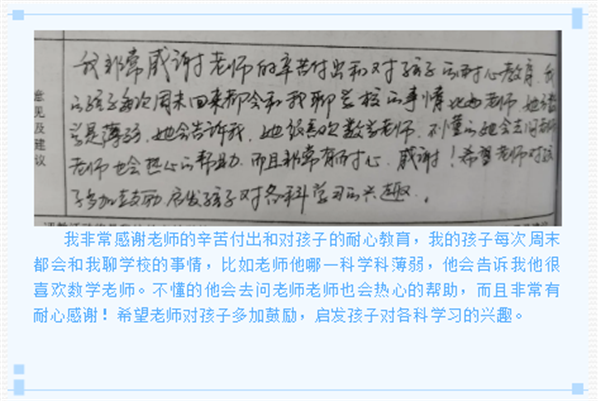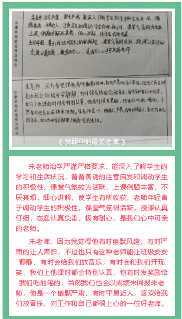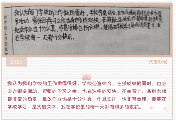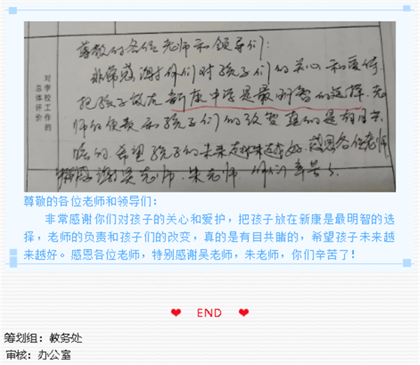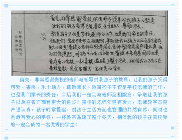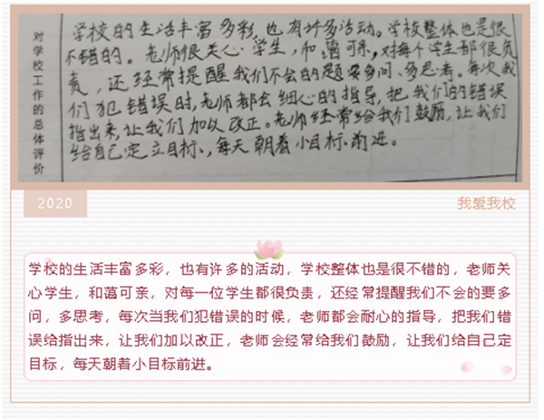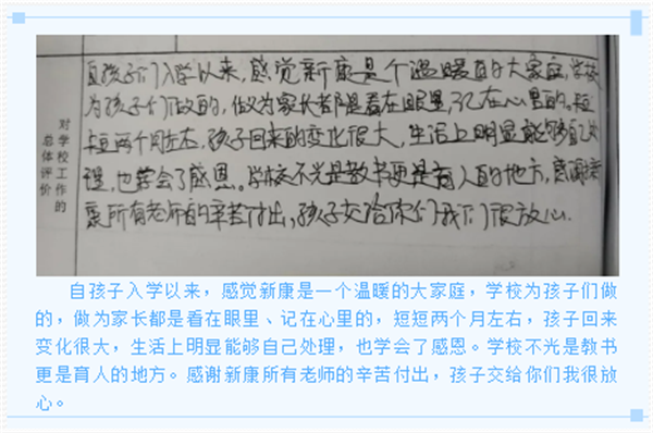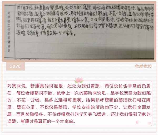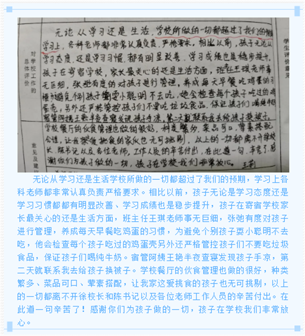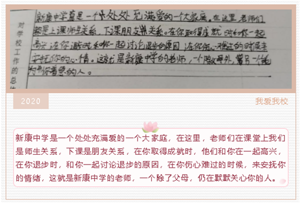 在以徐校长为首的管理团队接手新康中学以来,合肥新康中学发生了翻天覆地的变化,赢得了学生和家长的良好口碑。我校于2020年11月开展了教育教学评价工作,征求学生和家长对学校教育教学工作的意见和建议。学校、家长对以徐校长为首的新康团队精心打造后新康中学的蜕变给予高度评价。这既是对我们的肯定,也是对我们的鞭策。我们将此化作继续前进的动力。现从评教表中选取部分学生的评价进行展示。