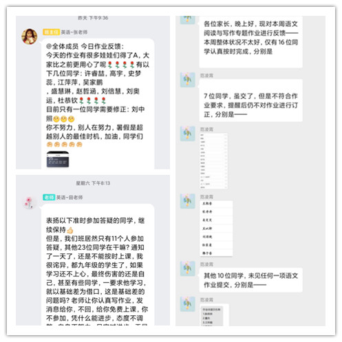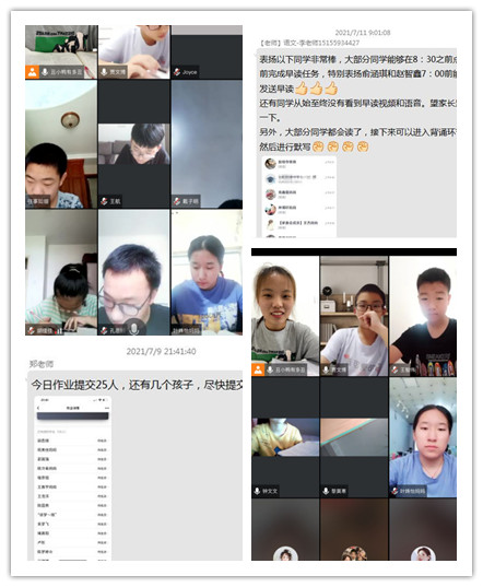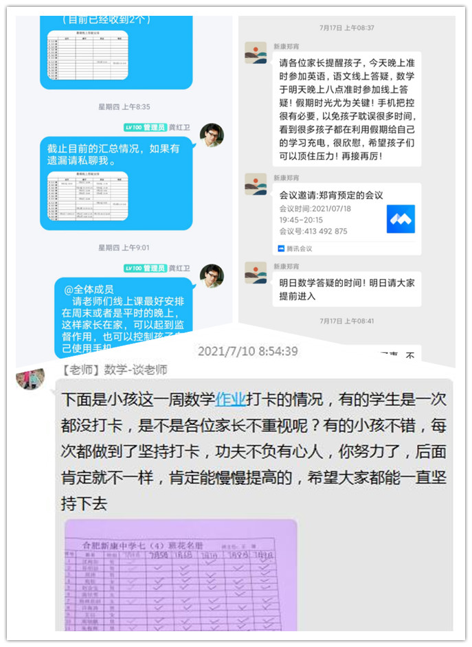 暑假开始前,合肥新康中学德育处联合教务处,印发了合肥新康中学学生暑期生活指导手册,里面详细的介绍了孩子们假期的拓展任务、读书目录、社会实践以及每天需要完成的各科作业。假期生活开启后,各班主任及任课老师建立作业监督、检查、及反馈制度。早晨七点准时在班级群里提醒当天各学科的任务安排,语文、数学……甚至体育,帮助孩子有效利用时间,提高学习效率,晚上由家长发作业打卡,老师根据学生完成情况,进行反馈。校领导时时关注群里动态,发现问题及时与相应教师沟通,要求及时整改,建立有效的学校抽查、反馈机制。
