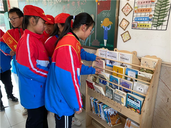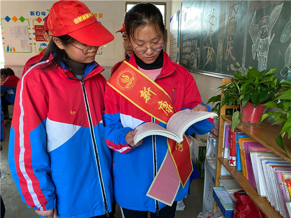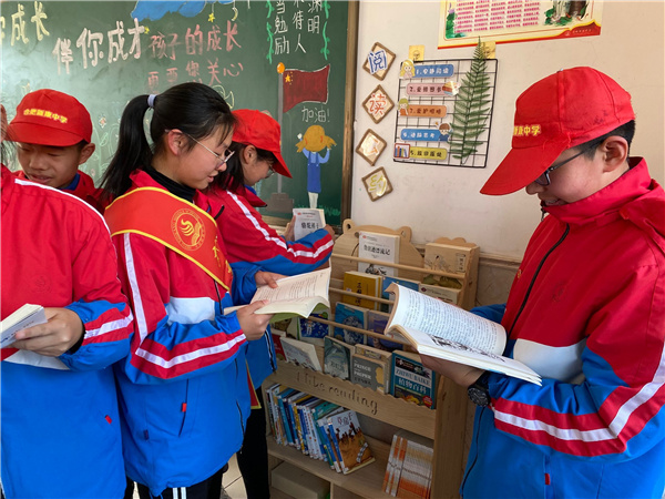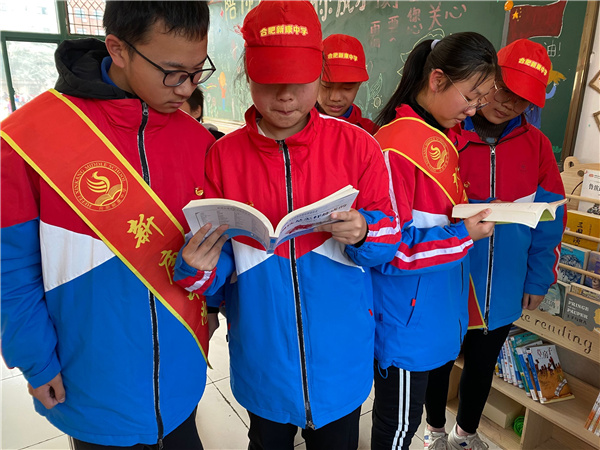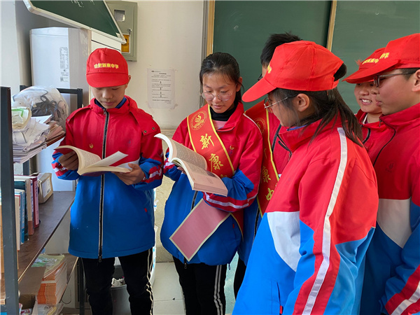 共青团员们胸前佩戴共青团团徽,戴着志愿绶带和小红帽,秉承着严谨的精神,发挥了共青团员的模范带头精神。进入七八九各年级的班级图书角,审查班级的图书数目。对于不利于中学生健康的言情小说、玄幻小说等灰色读物,给予没收,并对班级进行劝导和教育。