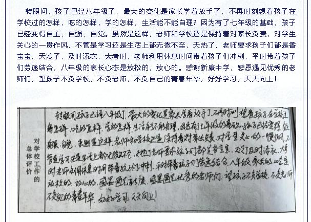 学校的发展离不开学生和家长的肯定和支持,2021年我校于4月份和12月份分别开展两次教育教学评价意见征询活动,赢得了学生和家长的一致好评,新康中学将继续狠抓教学质量,为广大莘莘学子的成长、成才、成功而不懈努力。
