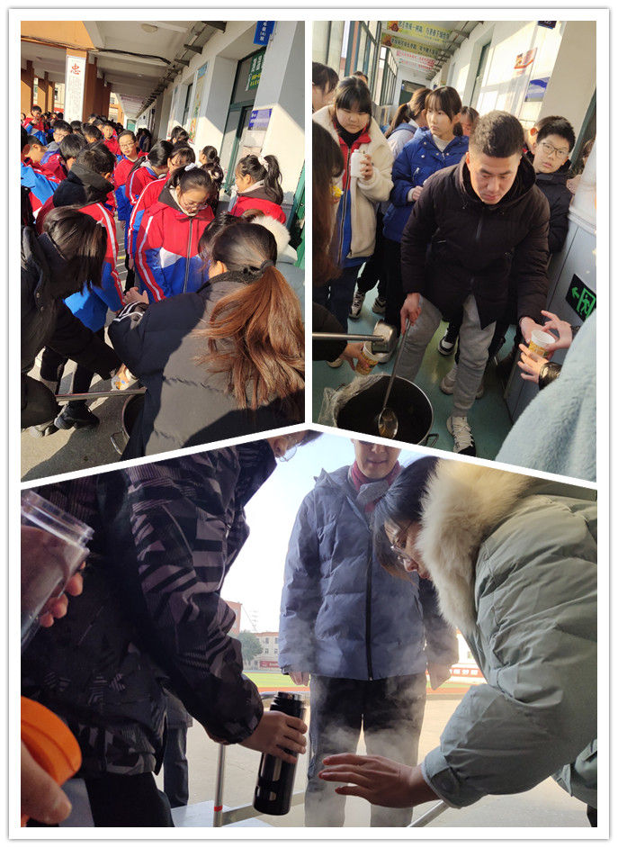 上午第二节下课,餐厅的工作人员就满脸喜悦的抬着几大桶姜糖水送到了教学区各楼层,有专门人员亲切的给同学们打汤。同学们拿着杯子从班级出来,有序的排着队伍,很快一杯杯热气腾腾、清香扑鼻的姜糖水,被打汤的老师送到同学们的手上,他还热心的提醒同学们小心烫手,喝完之后还想喝就继续来打。同学们喝着姜糖水,听着老师的关心,心中无比温暖。