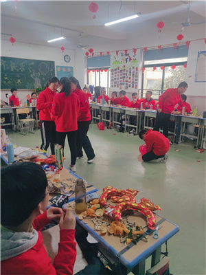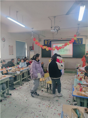 张灯结彩庆元旦,欢乐喜庆迎新年。各班都是“虎年大吉喜气迎、虎头扬扬好运来”,虎虎生威、福虎生旺、虎年大吉……这些表达期盼祝福的图画、标语贴满和挂满教室,还有各式的彩带、彩旗、五彩缤纷的气球,让整个班级充满节日的喜庆气氛。