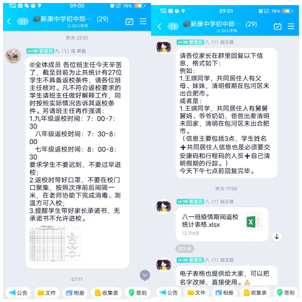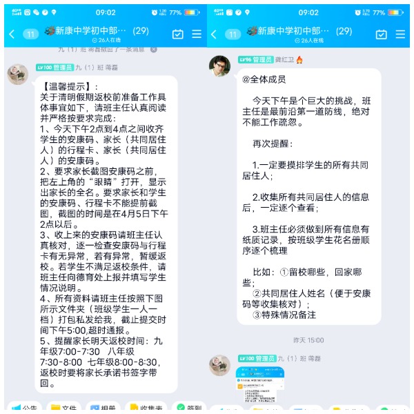 会议结束后,学校于下午4:30紧急召开了线上班主任会议,对于清明假期学生返校做了重要要求。要求班主任进行学生及共同居住人的两码收集时,要做到详细摸排共同居住人的行程,对于不符合返校要求的学生要追根溯源,精准摸排,如实上报。同时,对于不能返校的学生做好安排,对于学生本人或同住人是省外返肥,或省内他市返肥,或健康码异常等情况的,要按照防疫要求正确处理。
