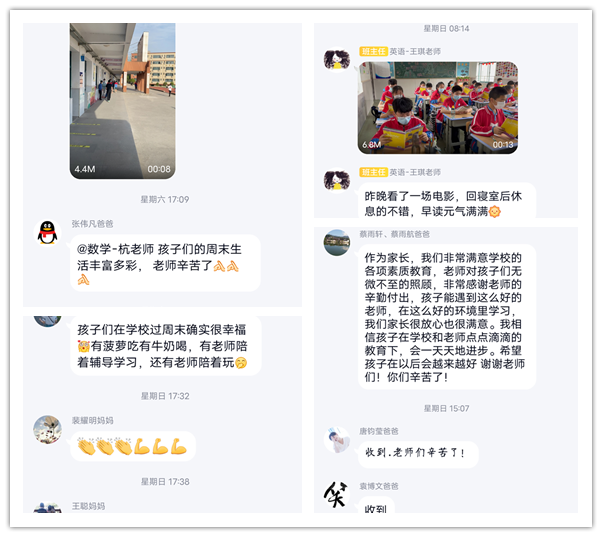 另外,所有老师积极与不放心的家长们保持联系。家校群中的一张张照片反馈学生在校的生活和学习情况,家长们看到孩子们被照顾的如此周全,纷纷在群里发言表示感谢。我们用尽职尽责的工作态度,用充满温度的具体行动,让同学们感受到学校的温暖,让新康的每一位家长放心!