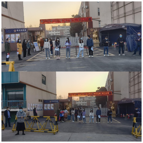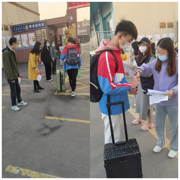 11月7日早上6:20,按照学校防疫部署,学校领导和毕业班老师组成的防疫人员于学校门口指定位置到岗。徐校长、龚校长等领导在校门口指挥并督导防疫人员认真履责,班主任收集和检查学生的健康承诺书和行程记录表等返校材料,防疫人员对学生进行体温测量和行李消毒,此外还有保安人员维护秩序,交通疏导员疏导交通等。在全体人员的共同努力下,所有符合返校要求的毕业班学生都安全返校。