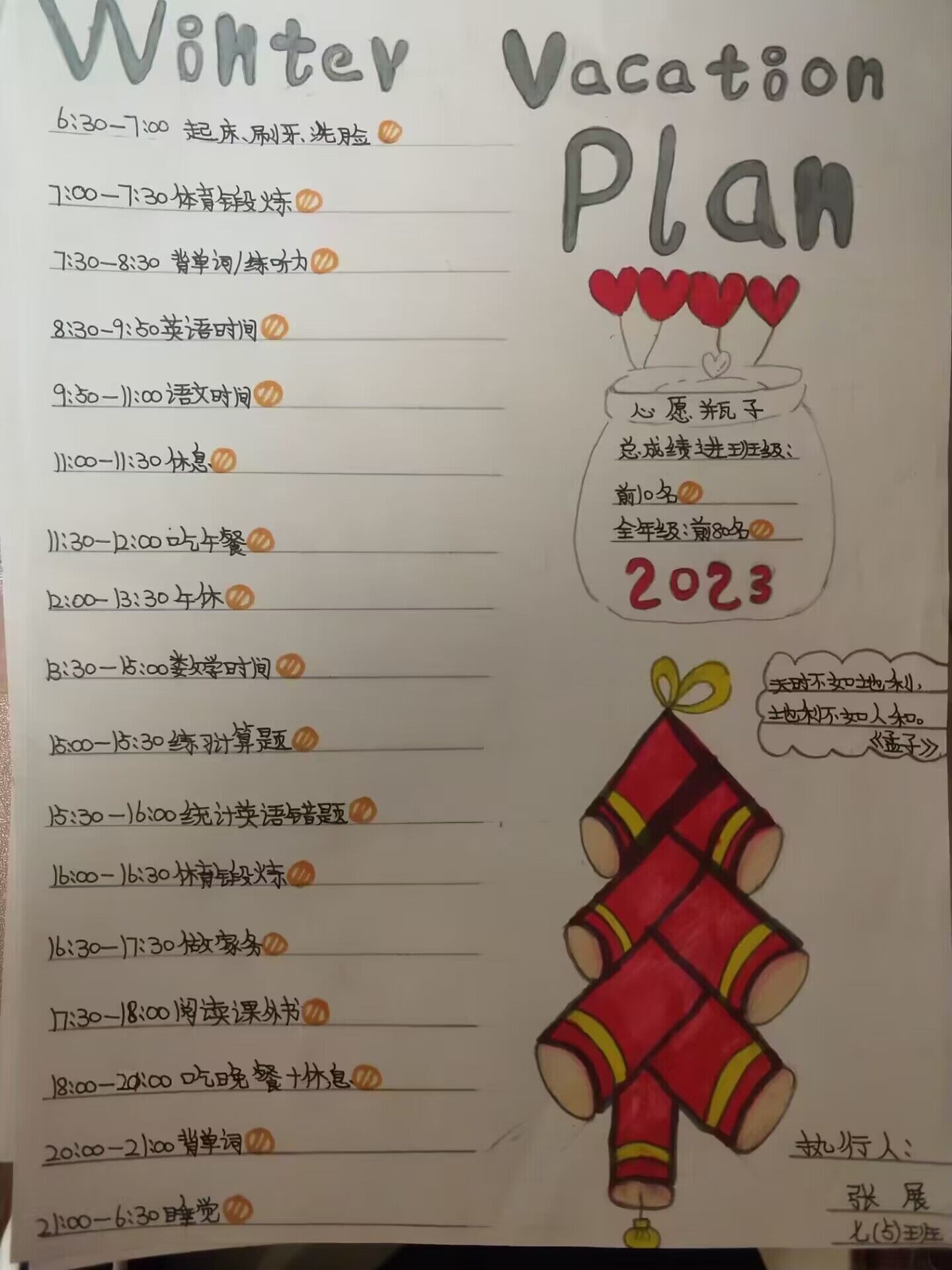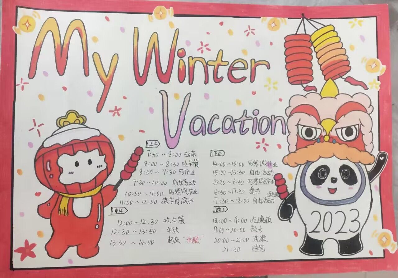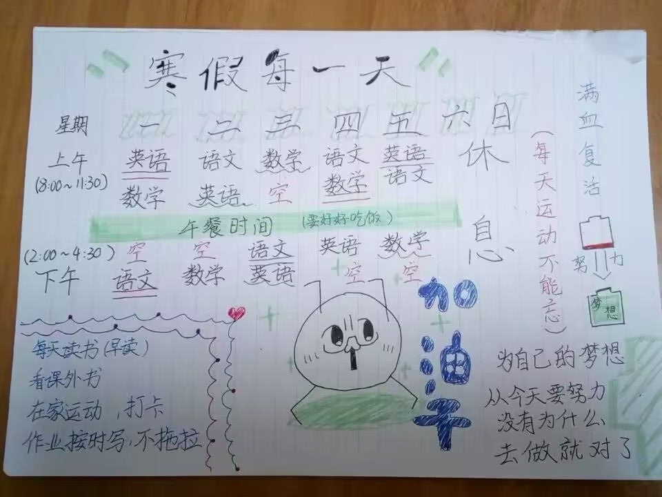 孩子们的寒假计划安排表不仅制作美观、精良,而且内容丰富,有学习、体育运动、阅读、劳动、课外实践、书法……他们真用心啊!