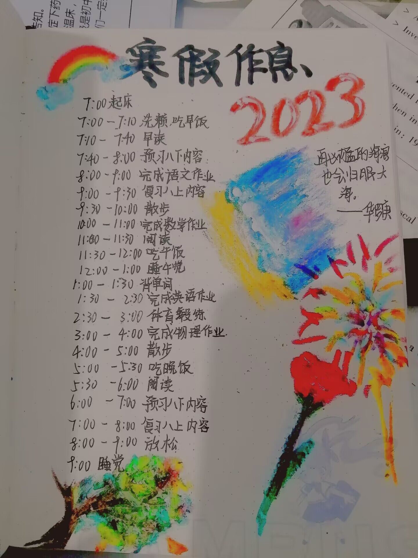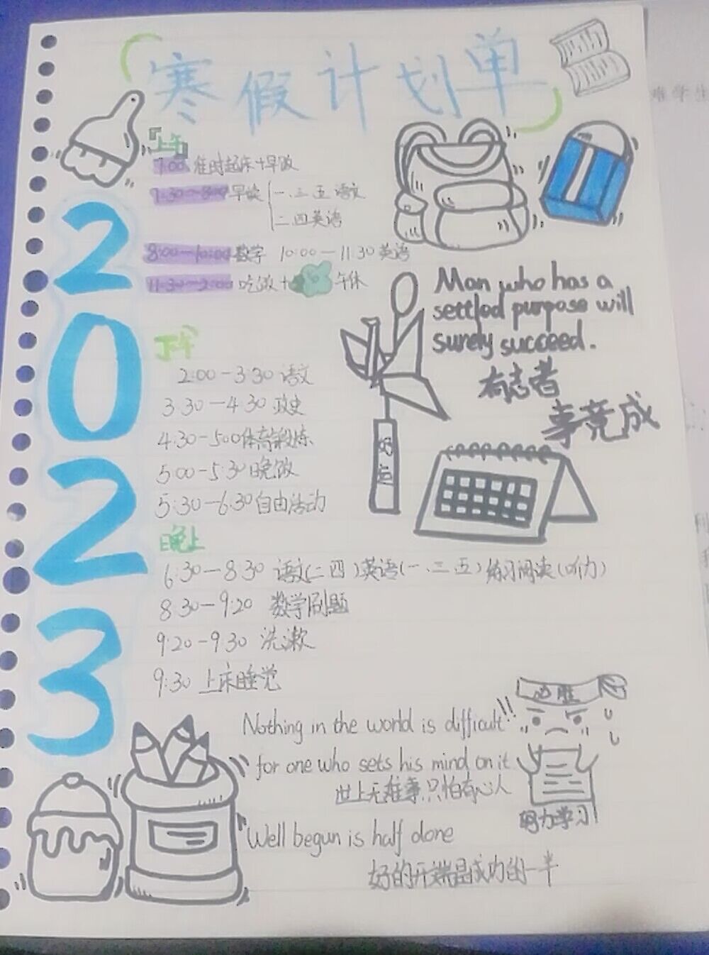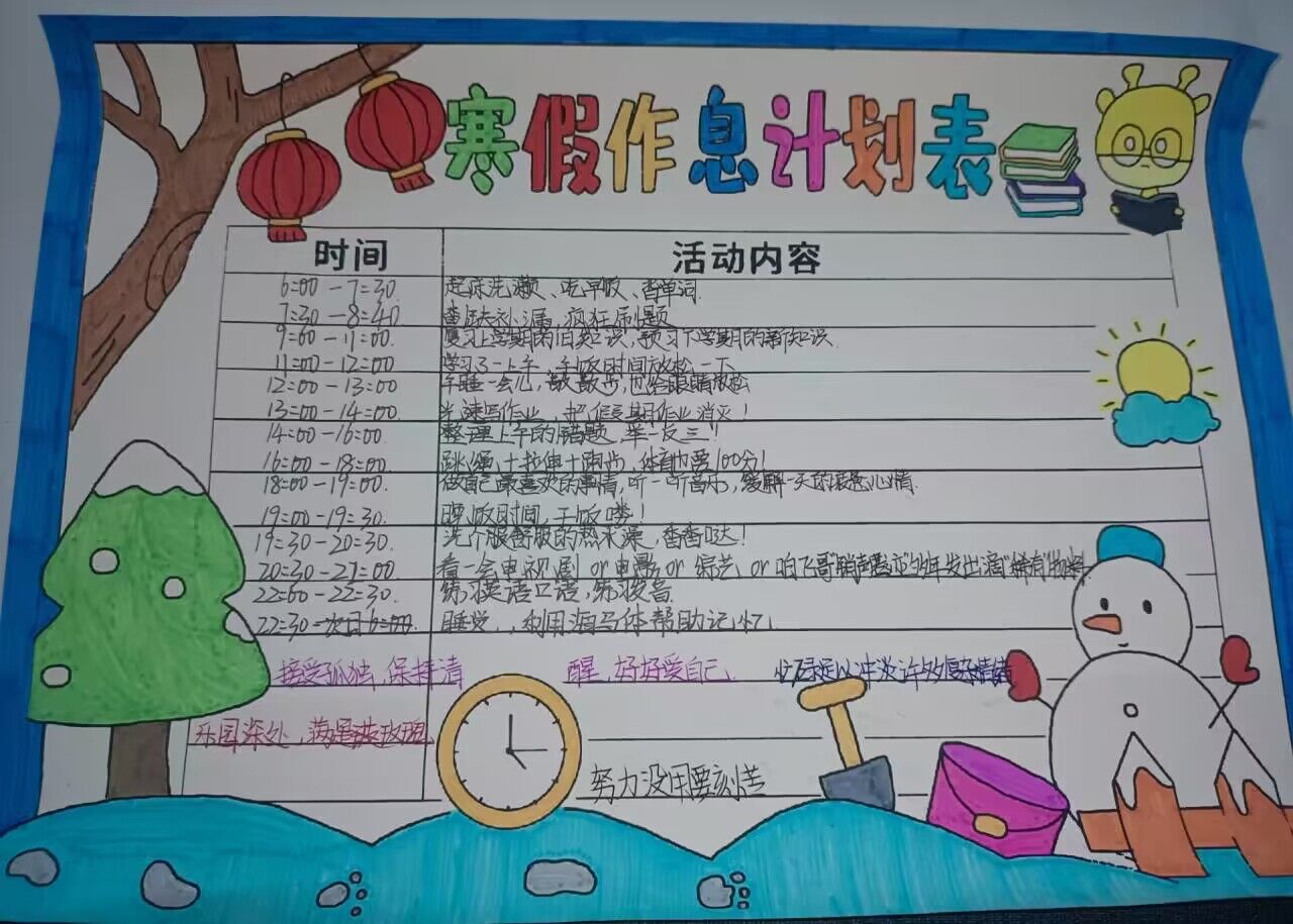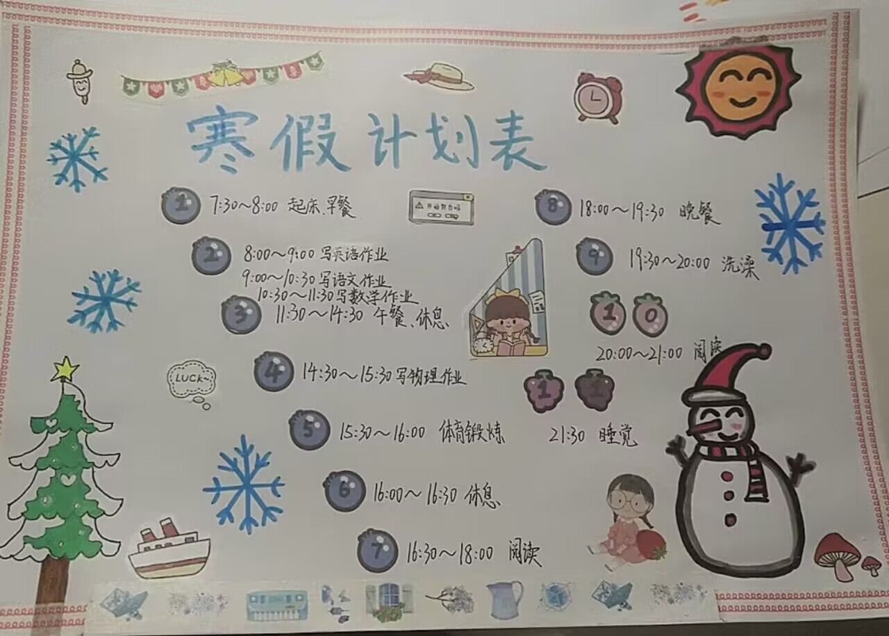 合理的时间规划有利于学习和生活的平衡,能使每一天都充实而井井有条。怎样才能过上一个丰富充实有意义的寒假呢?合肥新康中学初中部全面贯彻落实“双减”政策,坚持五育并举,知行合一,指导同学们在寒假里自主学习、自主探究,自觉制定寒假计划表,科学合理规划自己的学习和生活。