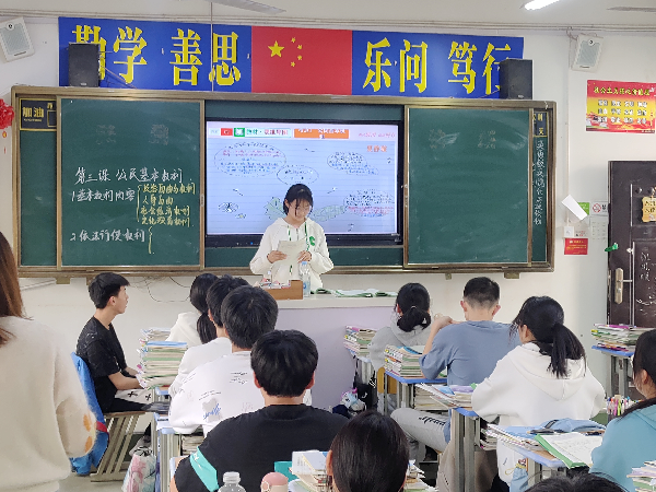 3月8日下午在新康中学九年级五班举行了一场形式新颖的中考一轮复习公开课。课堂开始朱佳老师就给学生呈现有关公民权利的关键词,让孩子们围绕关键词自制思维导图并上台讲解。学生们的作品各具特色,内容讲解也是绘声绘色。朱老师这一环节的精巧设计充分发挥了学生的主观能动性,让学生建构自己的知识体系以真正理解并把握知识。随后在一则“女车主维权”新闻热点事件的探讨中,朱老师让学生充分表达自己的意见,最终学生达成需依法维权的共识并在心中植根法治的种子,做到了“用教材教,而不是教教材”。最后,在“直击中考”环节朱老师精选有关真题,针对性进行练习。