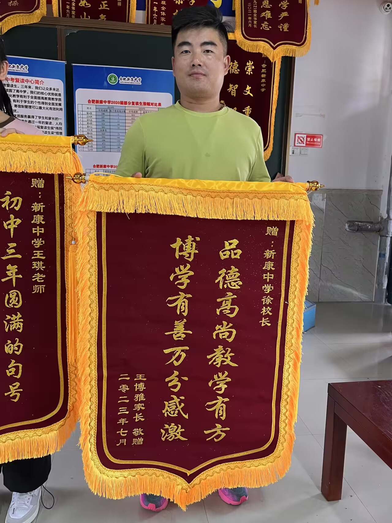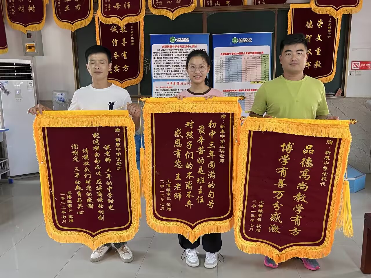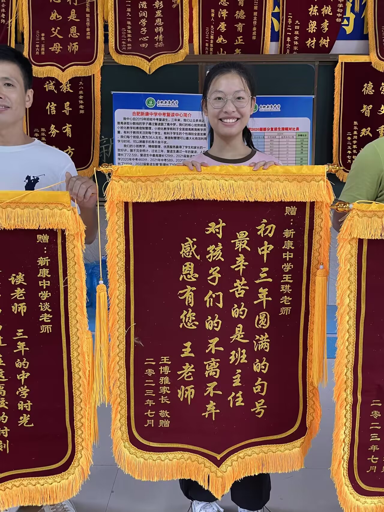 2023届优秀毕业生王博雅同学及其家人向学校及恩师赠送锦旗,表达对母校精心培育和老师辛勤付出的感激之情。学生家长表示:学校的坚强后盾,班主任老师的倾情陪伴,任课老师的谆谆教诲,是孩子取得优异成绩的保证。感谢母校和老师三年来对孩子的精心培育和辛勤付出。