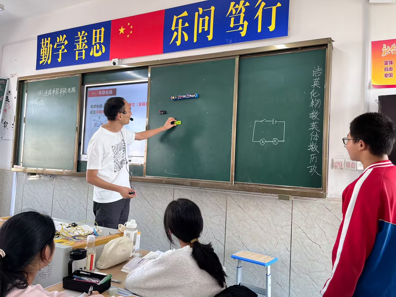 10月16日上午第四节课,物理组汪宁波老师在九(7)班给孩子们带来了一场别开生面的公开展示课。公开课的主题是《探究串并联电路》,汪老师从生活实例导入课题,体现“从生活走向物理”的课程理念,并设置一系列任务,让学生深度参与,进一步引导学生探究串联和并联电路。同时利用问题导向促使学生深度思考,运用所学的物理解决生活中的实际问题,对学生进行多元化的积极性评价,凸显新课标所倡导的“教-学-评”一体化的教学理念和育人模式。课堂气氛十分活跃,学生的参与度很高,教学效果很好。