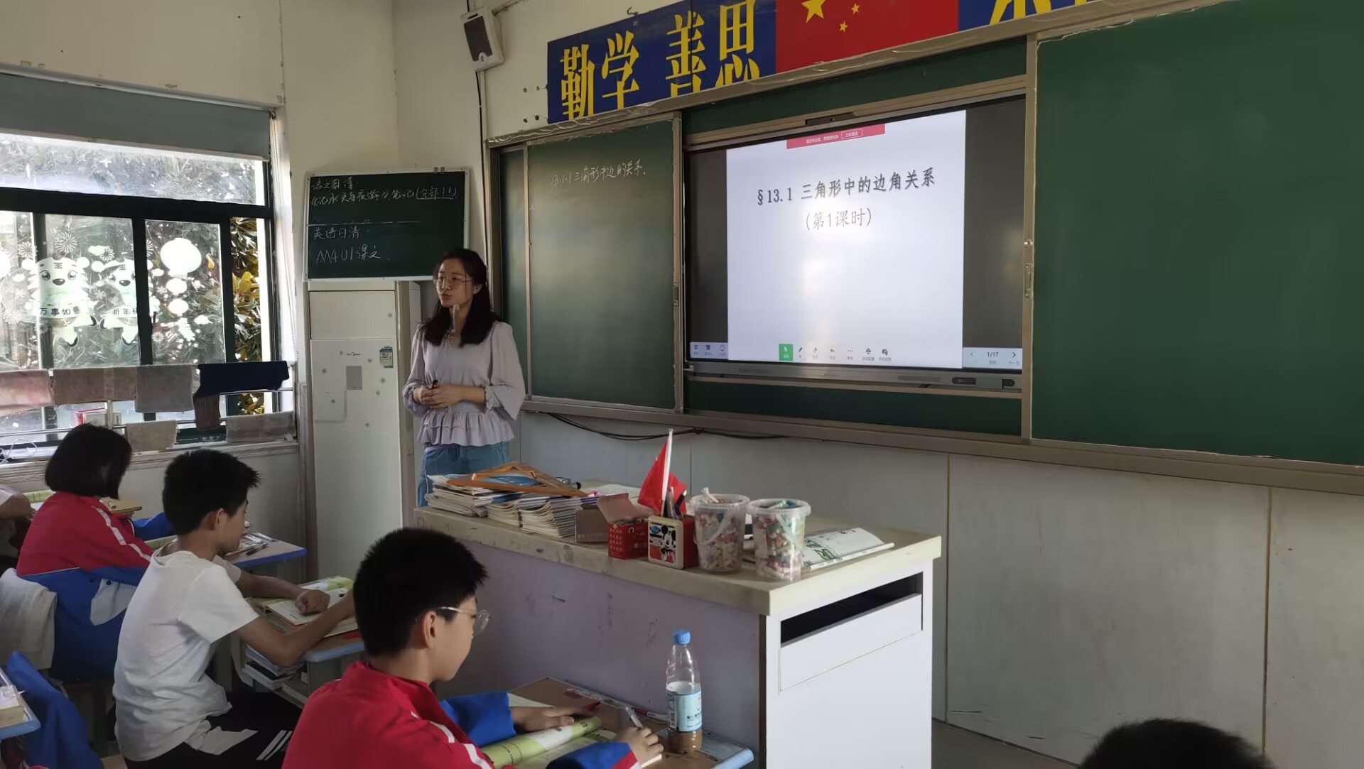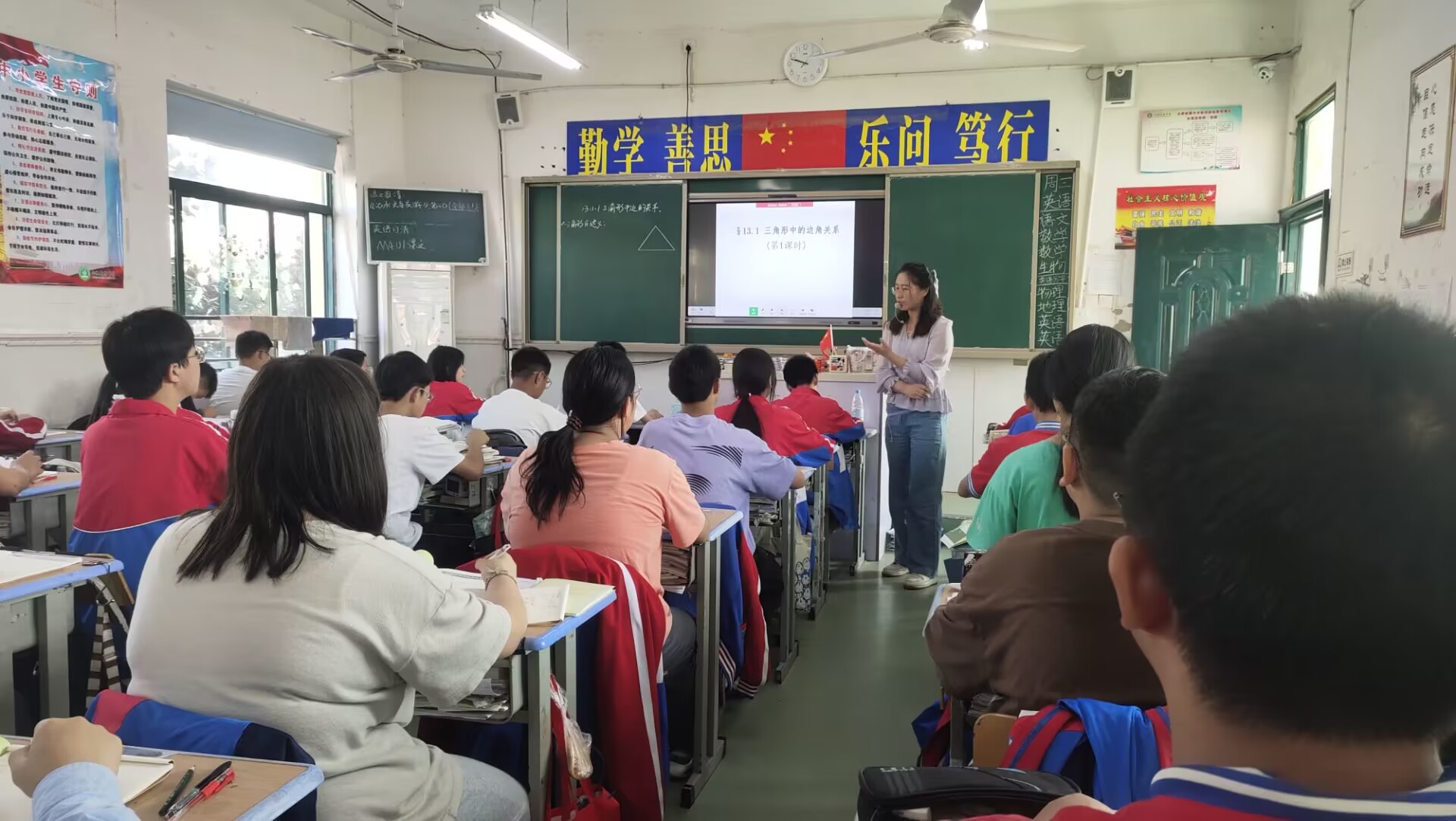 10月18日上午第三节课,王洁玉老师在八(3)班进行数学公开课《三角形中边的关系》。本节公开课引导学生进一步认识三角形并利用三边关系解决问题。在实施本节课教学中,王老师教学目标明确,重难点把握得当,课堂环节自然流畅,语速始终,富有感情。利用实际情境引导学生得出三边关系,调动学生的积极性并很好的达成了本节目标。在例题环节,请学生到黑板板演不仅能展示学生个人风采,也能通过板演对学生进行矫正和反馈,及时发现、解决问题。教学中反复恰当的渗透数学思想,让数学思想方法在与知识能力形成的过程中共同生成。