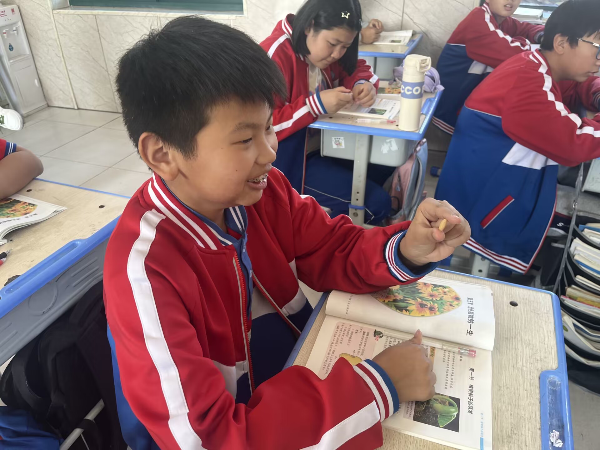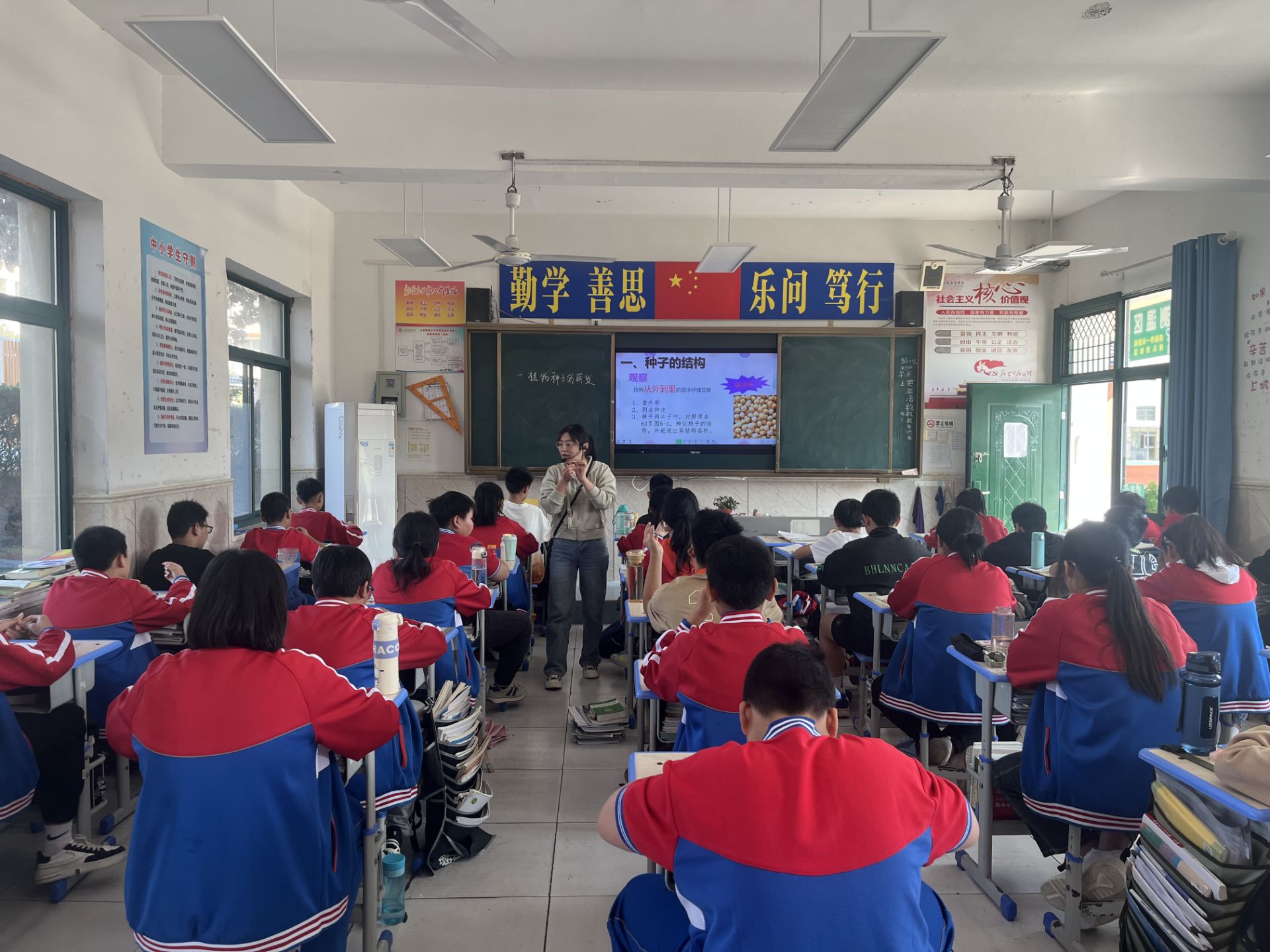 10月20日杨娟老师在七(2)班进行生物公开课,课堂开始以观察芸豆种子结构实验导入,极大的调动了学生的学习兴趣,采用做实验的导入方法也完全贴合生物属于实验学科的性质。在教学过程中,杨老师利用多种教学方法相结合的方式使得教学内容简洁明了,直观易懂。利用动画演示了种子萌发的过程,使抽象的知识变得生动有趣,突破了本节的难点;采用问题引导的方法让学生以小组为单位自主学习讨论,这充分培养了学生的自主探究和小组合作能力。