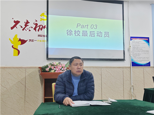 徐校长最后做总结和动员讲话。徐校长用一二三对同学们提出了具体的要求:“一种精神”:敢于梦想、敢于拼搏、敢于成功;“两项管理”:时间管理、自我管理;“三个注意”:注意书写、注意薄弱学科、注意政史学科;